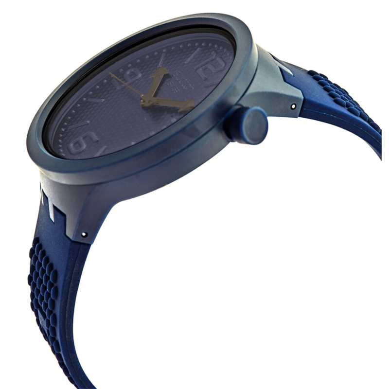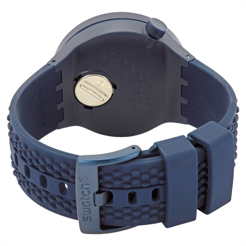 Blue plastic case with a blue silicone strap. Fixed blue plastic bezel. Blue dial with luminous gunmetal hands and index hour markers. Arabic numerals mark the 3, 6, 9 and 12 o''clock positions. Minute markers around the outer rim. Dial Type: Analog. Luminescent hands. Quartz movement. Scratch resistant mineral crystal. Pull / push crown. Solid case back. Round case shape. Case size: 41 mm. Case thickness: 10 mm. Band width: 20 mm. Tang clasp. Water resistant at 30 meters / 100 feet. Functions: hour, minute. Casual watch style. Watch label: Swiss Movt. Swatch Quartz Blue Dial Blue Silicone Watch SO27N100.