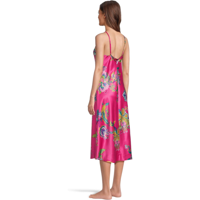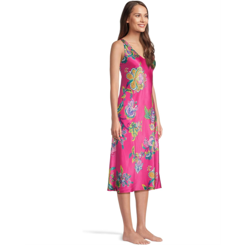 - Timeless allure and uncompromised comfort in the N by Natori Festival - Satin Gown. Designed with a relaxed fit that flows beautifully on every silhouette, this gown offers the perfect balance of comfort and sophistication. The V-neckline and sleeveless cut highlight a graceful, feminine frame, while the below-the-knee length keeps it effortlessly refined. Crafted with a luxurious satin hand feel and finish, every detail whispers indulgence against the skin. The pull-on style makes it as practical as it is glamorous, ideal for lounging, entertaining, or simply feeling divine at home. Featuring beautiful, bold prints, this gown turns everyday moments into a festival of style, adding vibrant energy to your evening rituals.