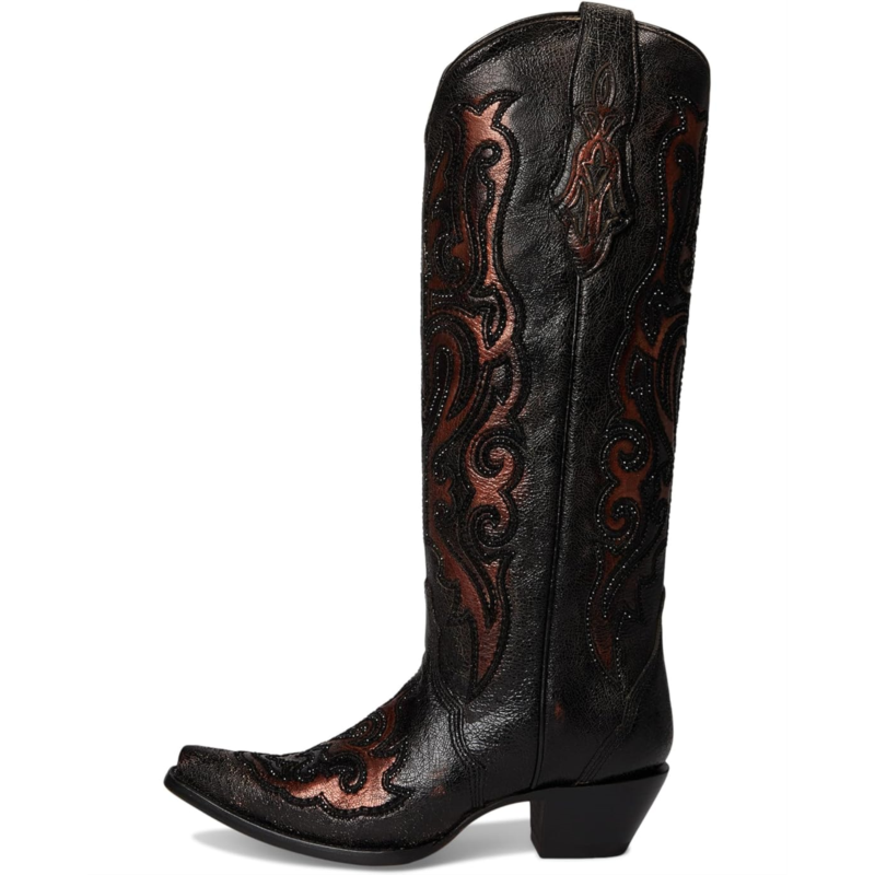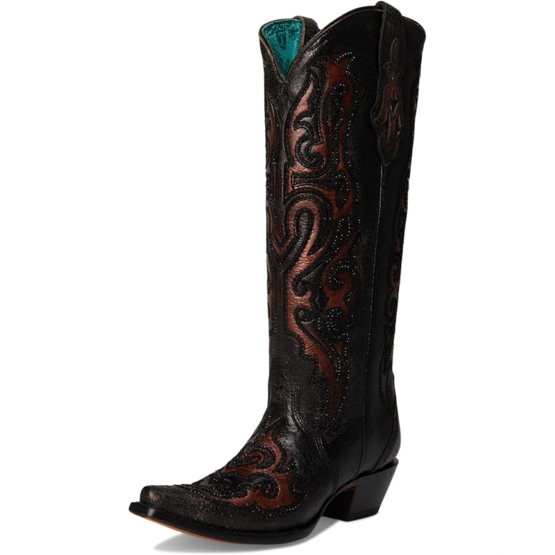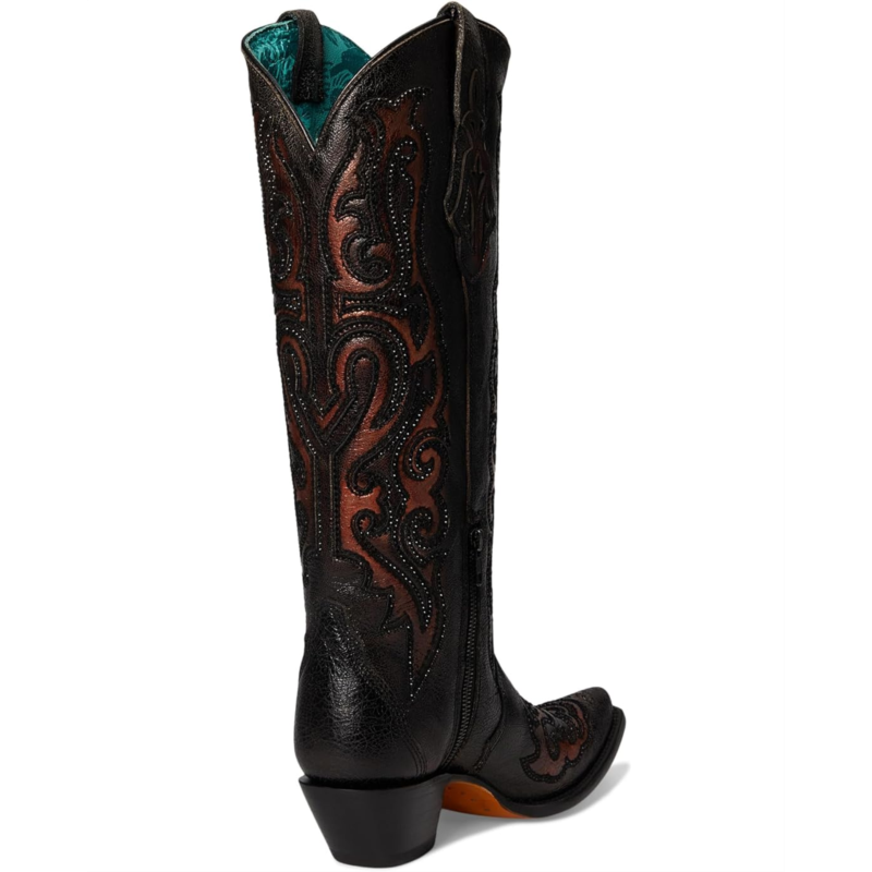 - Chic and comfortable, the Corral Boots A4738 features lady black bronze embroidery and crystals for an eye-catching twist. These knee-high boots are designed with a zippered side closure for easy wear. They are crafted with a leather upper, insole, and lining. These heeled boots make a stylish addition to your footwear collection.