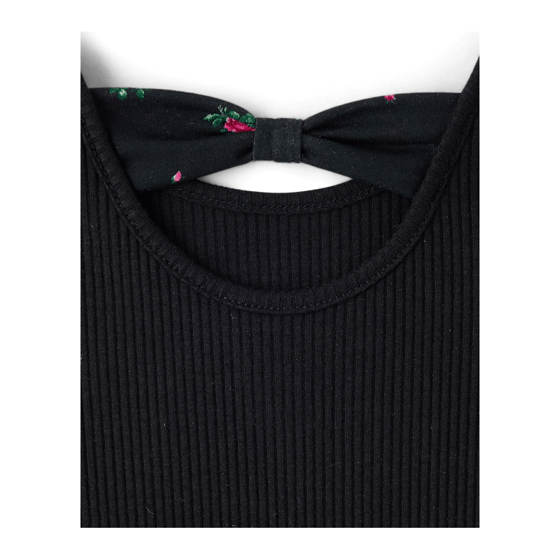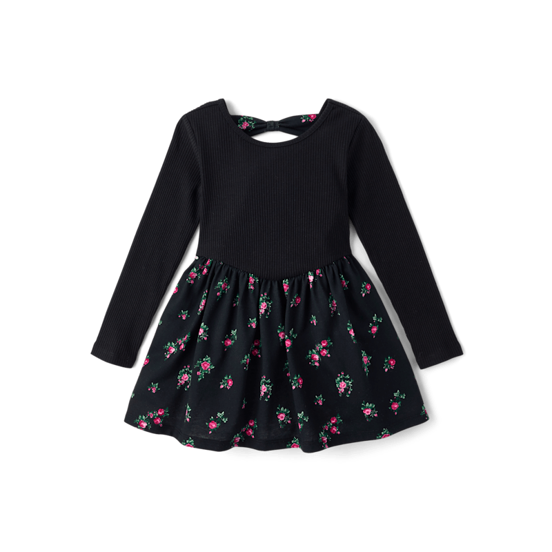 FEATURES: Ribbed bodice, cut-out & non-functional bow at back, floral print skirt, fabric finished for added softness & to reduce shrinkage