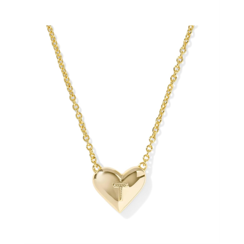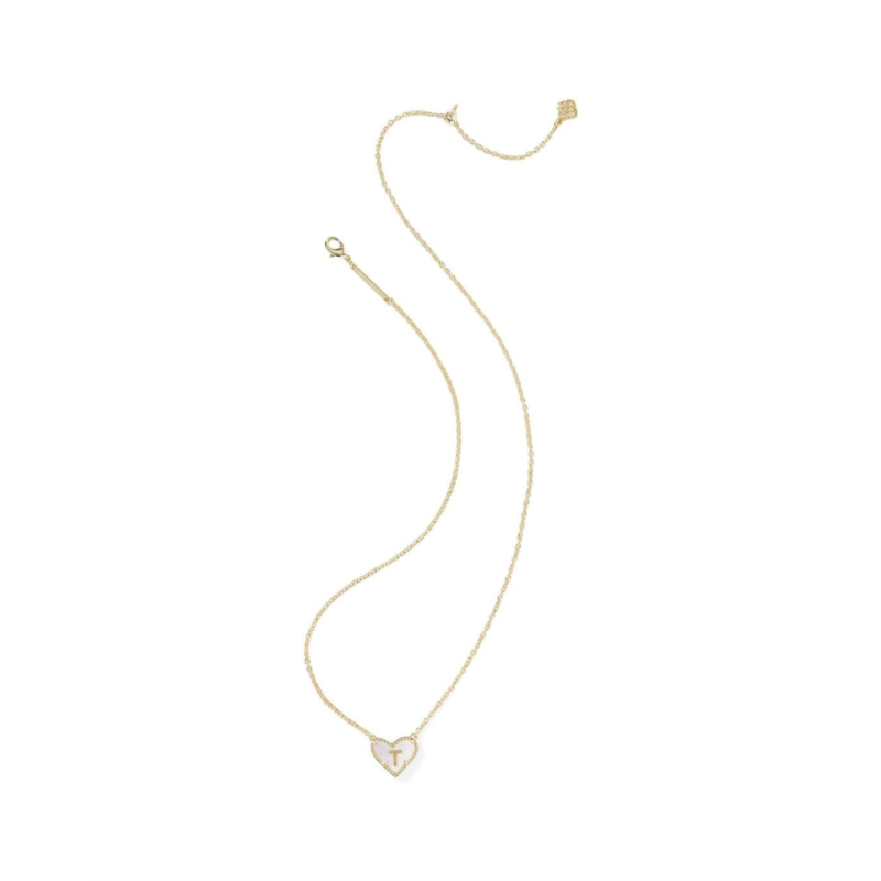 - Get ready to fall in love with the Kendra Scott Heart Letter T Short Pendant Necklace, destined to be your new neck stack essential. Featuring a sweet heart shape inspired by the iconic Ari silhouette, this necklace has a personal touch with a beautiful block letter at its center. The letter is repeated on the back so you can flip it for an all-metal look. It features a rhodium plated brass construction, a prong setting, and a lobster clasp closure.
