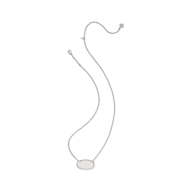 • Elevate your jewelry game styling the Elisa Statement Silver Iridescent Drusy Short Pendant Necklace from Kendra Scott, a dazzling twist on a fan-favorite icon. Featuring a sparkling heart-shaped stone inspired by the beloved Ari silhouette, this statement piece is rhodium-plated brass perfection with signature hoofprint detailing. Its prong setting and secure lobster clasp make it as reliable as it is radiant. Bigger, bolder, and unapologetically beautiful, this design draws on the bold dimensions of the archival Dylan Pendant Necklace to give you timeless drama with modern charm.