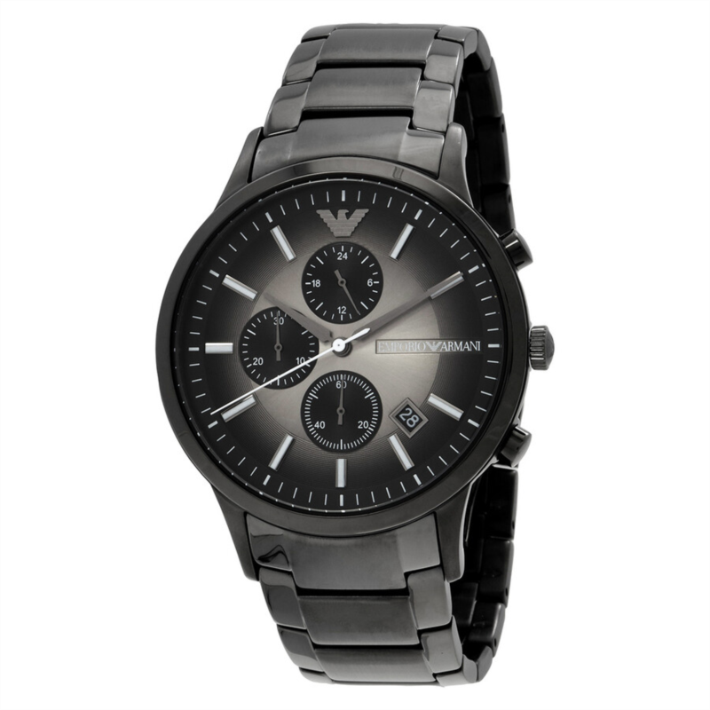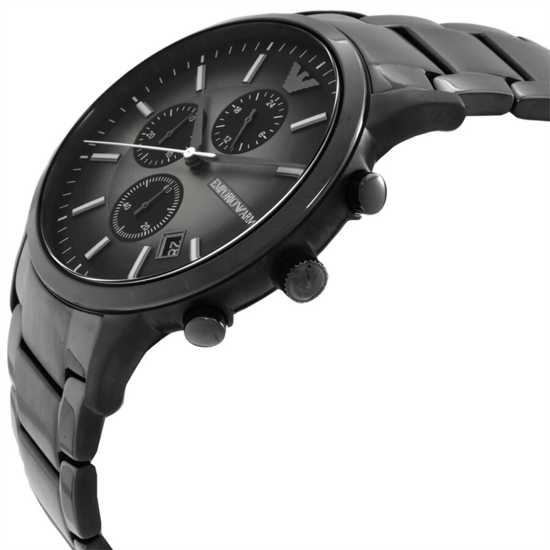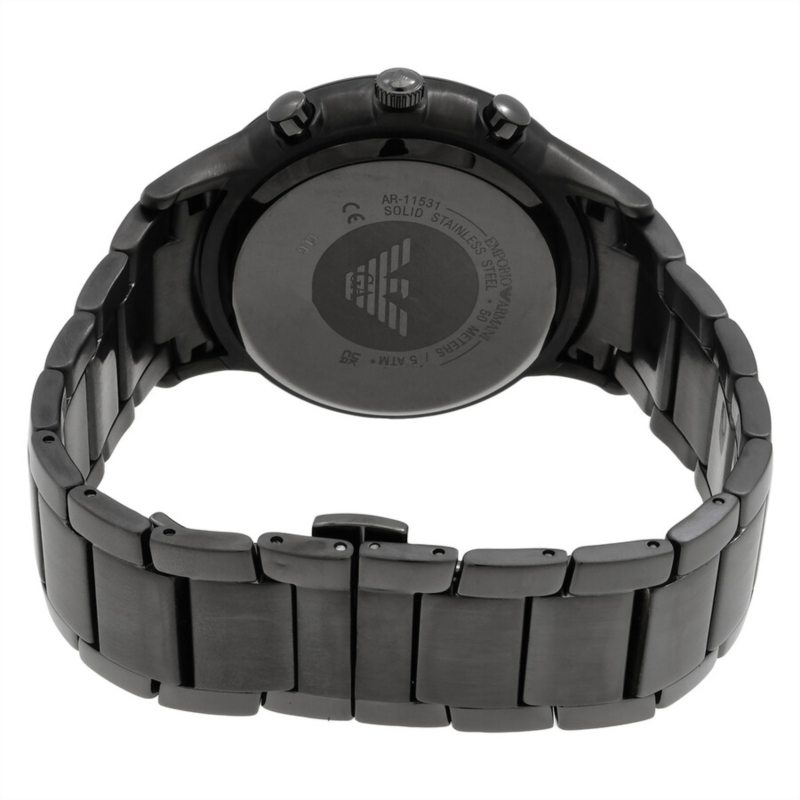 Gunmetal stainless steel case and bracelet. Fixed gunmetal stainless steel bezel. Black, grey dial with gunmetal hands and index hour markers. Minute markers around the outer rim. Dial Type: Analog. Date display between 4 and 5 o''clock position. Chronograph - three sub-dials displaying: 60 second, 30 minute and 24 hour. Quartz movement. Scratch resistant mineral crystal. Pull / push crown. Solid case back. Round case shape, case size: 42 mm, case thickness: 10 mm. Band width: 22 mm. Fold over clasp with a safety release. Water resistant at 50 meters / 165 feet. Functions: chronograph, date, hour, minute, second. Casual watch style. Emporio Armani Chronograph Quartz Men''s Watch AR11531.