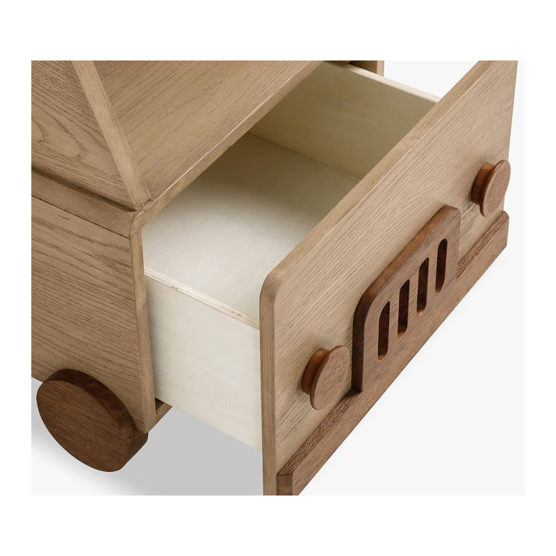 To start the dreamtime convoy, park our Truck Nightstand next to their bed. Set on decorative wheels, the whimsical wooden vehicle combines a spacious top, an open cubby with wire management for their charging cords and a deep drawer with a bumper, grille and headlight handles. Built to last from premium materials and oak veneer, it offers enduring quality?right off the lot.