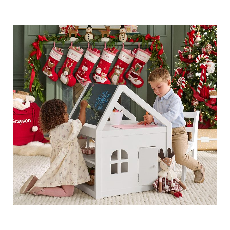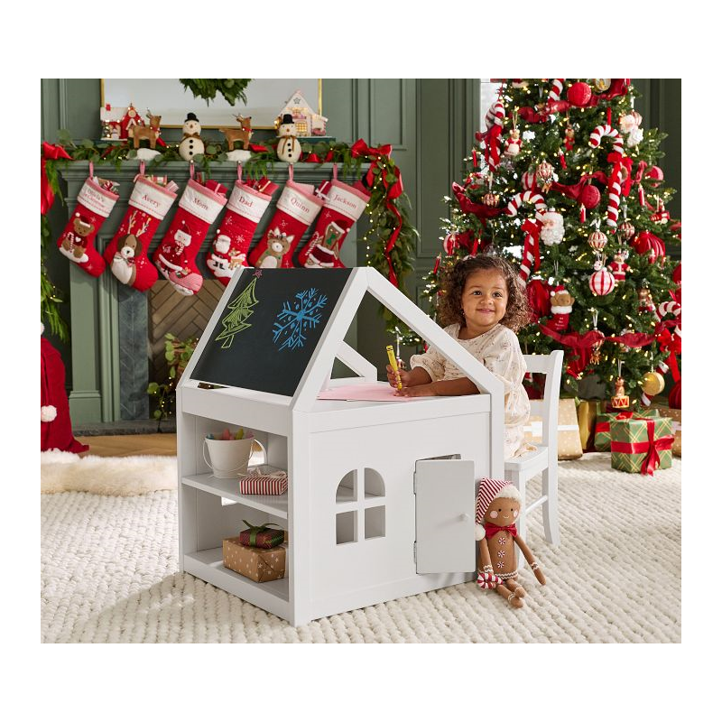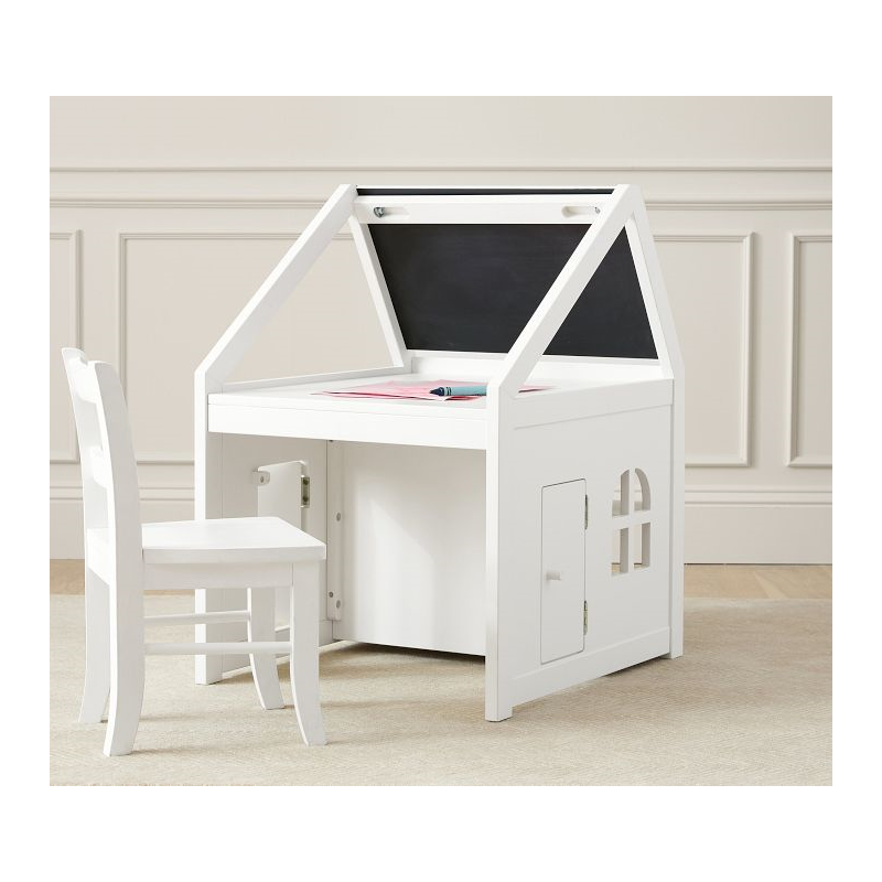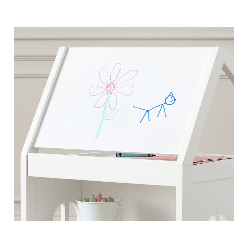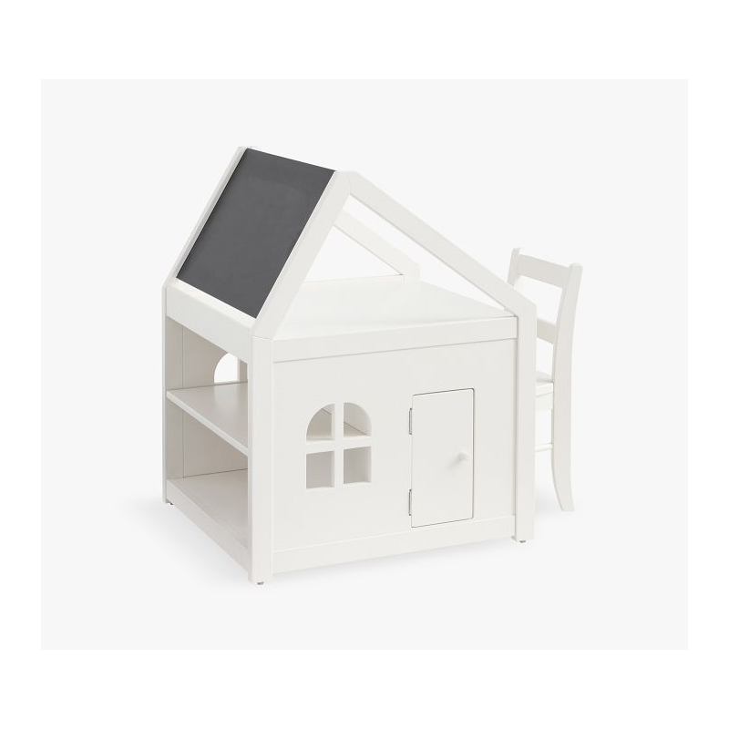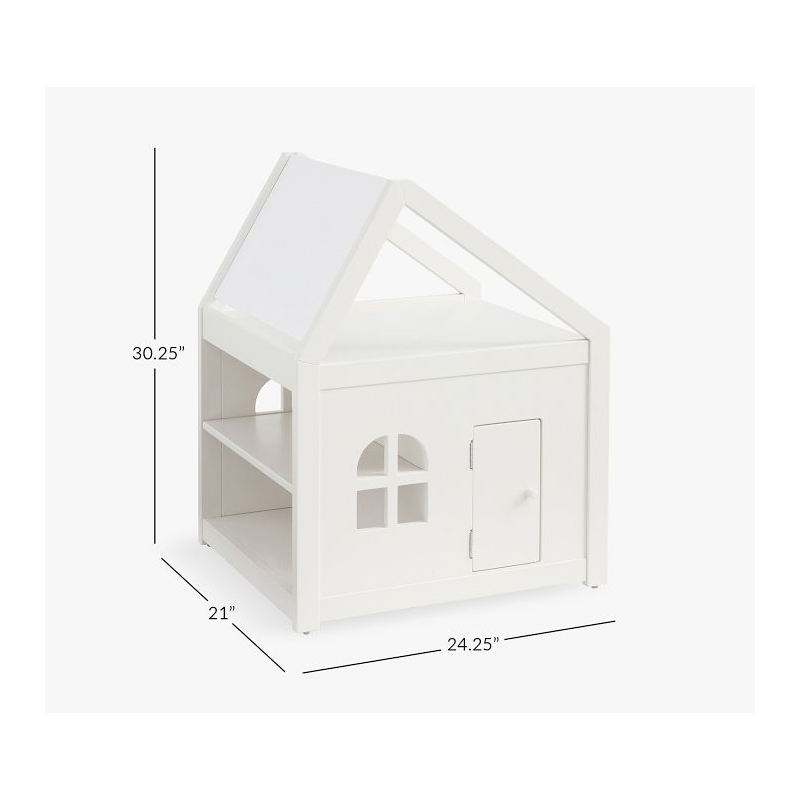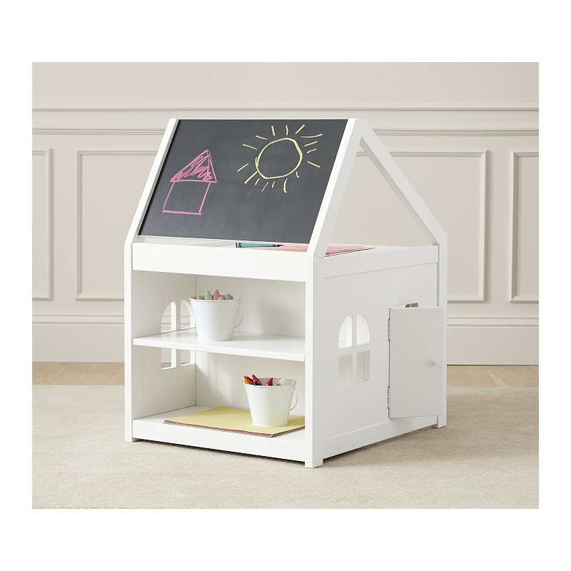 A happy home for their favorite activities, our Toddler House Play Table offers spacious accommodations for arts and crafts supplies, books, games and toys. The roof is paneled with a chalkboard and dry-erase board, and the upstairs provides a platform for drawing on paper or organizing supplies. The playful side door opens into a spacious cubby, while the back provides two fixed shelves. Crafted of durable wood with a multi-step painted finish, it arrives ready to furnish with their creativity.