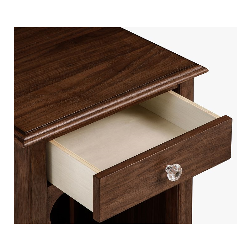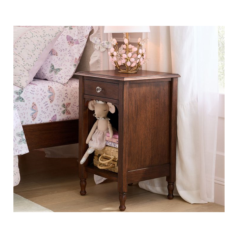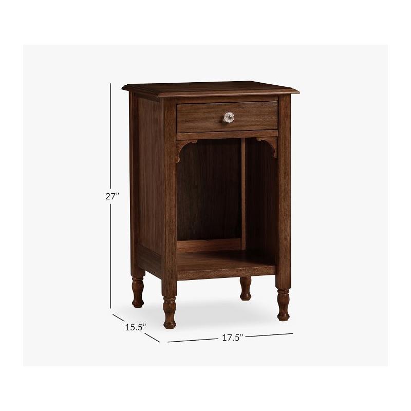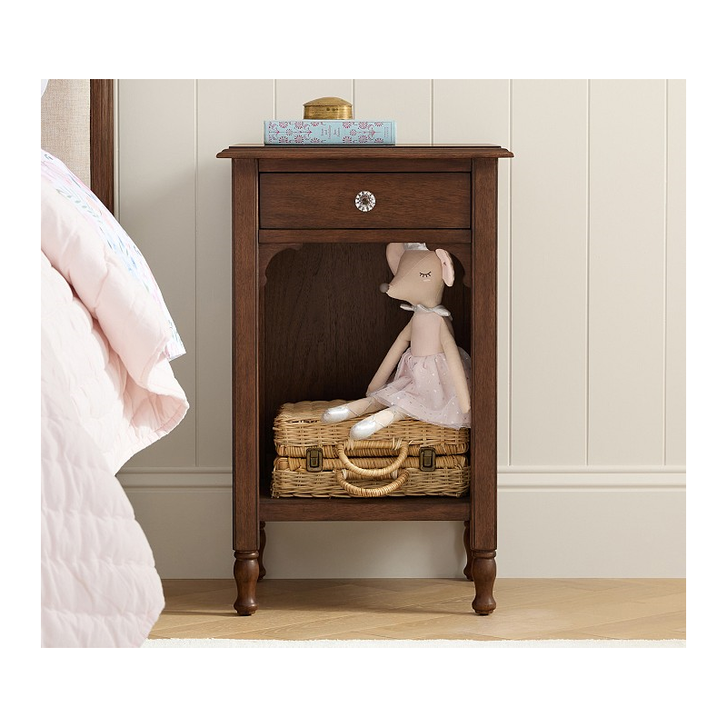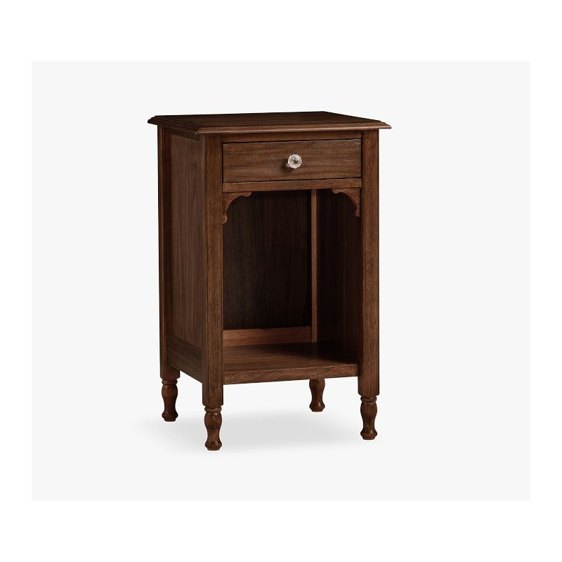 The easy charm of vintage cottage furniture is captured in our Juliette Collection, crafted to exacting standards of quality, design and longevity. The nightstand features curved molding and lathe-turned feet, along with a drawer and shelf to store their bedside essentials. Its finish is rendered in a meticulous, multi-step process, producing visible brushstrokes that bring subtle texture and dimension to the elegant tonal palette.
