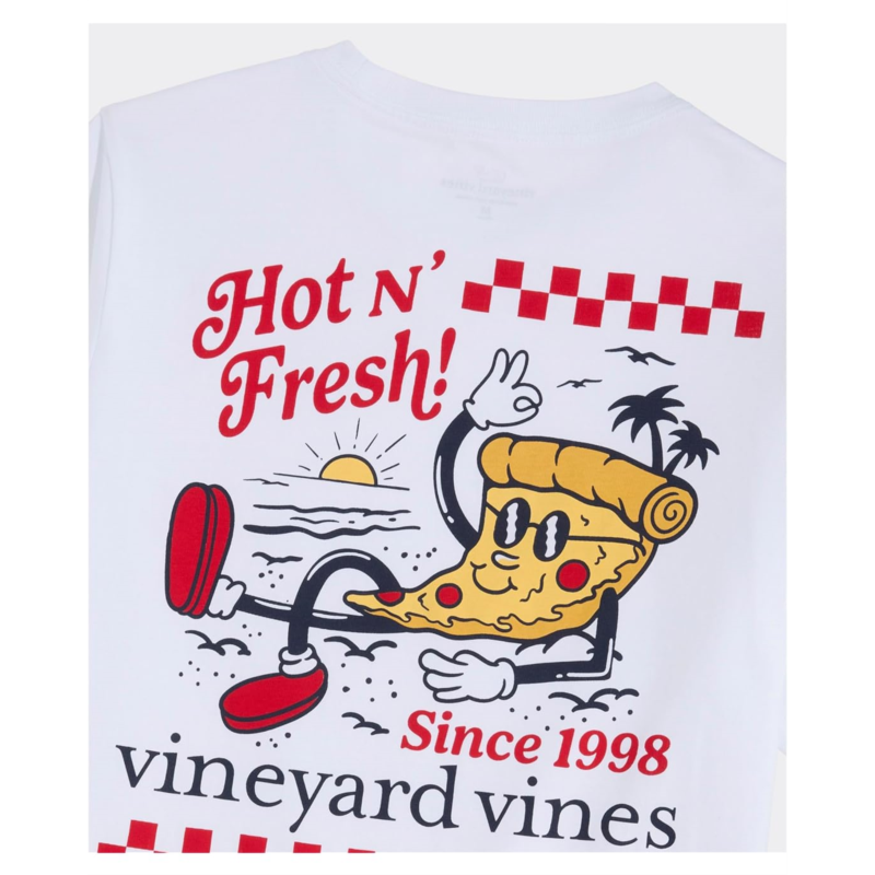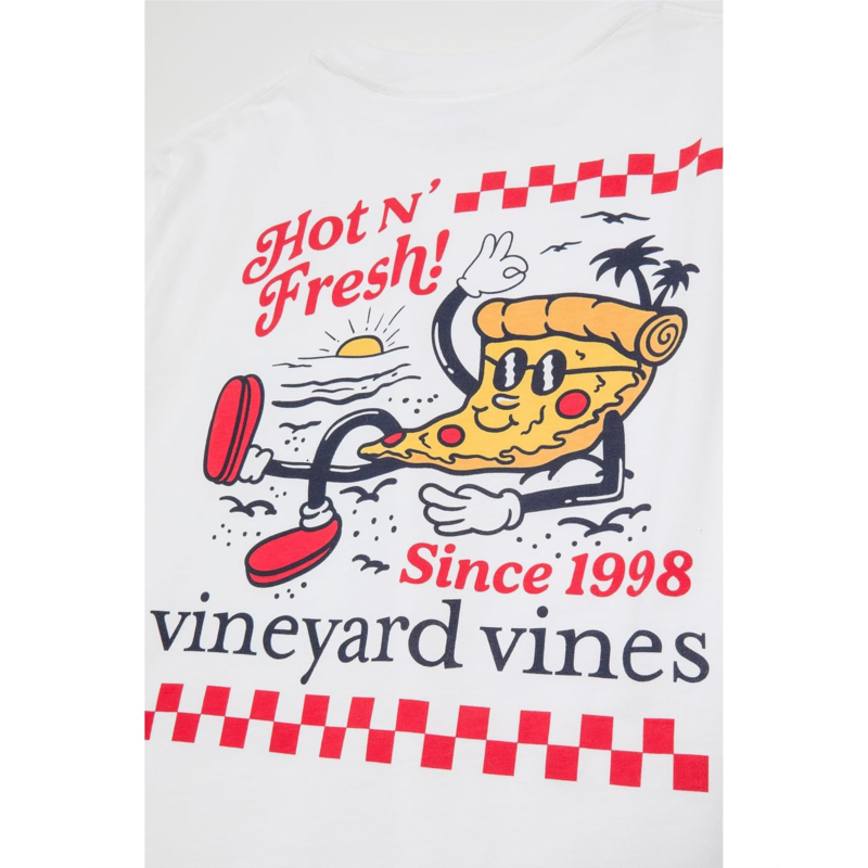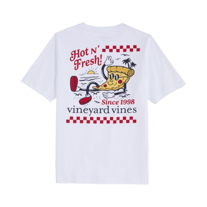 Crafted with a soft washed cotton fabric, the Vineyard Vines Kids Boys'' Hot N Fresh Short Sleeve Pocket Tee is the ideal pick for all casual dayouts. The pull-on style tee features a crew neck, short sleeves, a patch pocket on the left chest, and a straight hem. The graphic print and branding on the pocket and back offers an eye-catching detail.