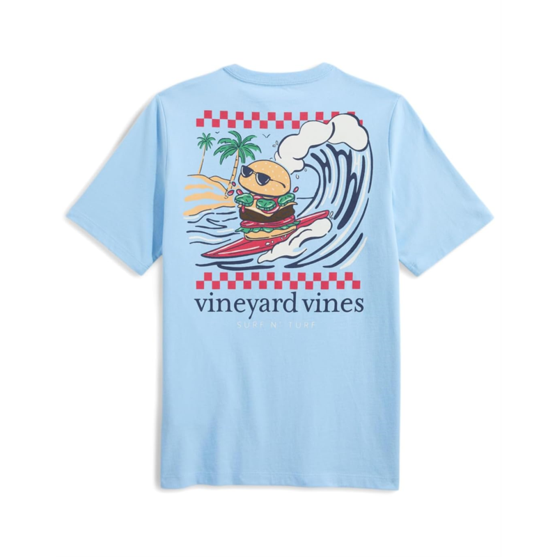 Let their personality shine with the Vineyard Vines Kids Surfin'' Burger Short Sleeve Tee, featuring bold graphics on the front and back for extra flair. Made from soft cotton fabric this pullover style tee features a ribbed crew neckline, straight hemline, and graphics print on the left chest pocket.
