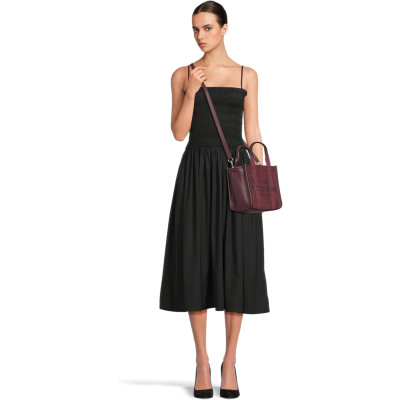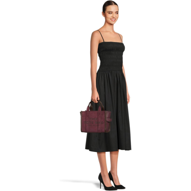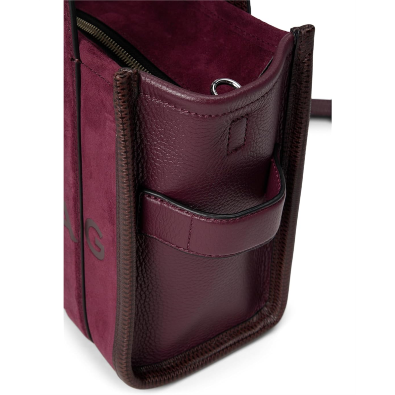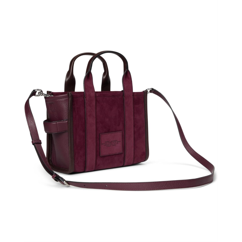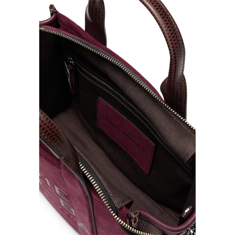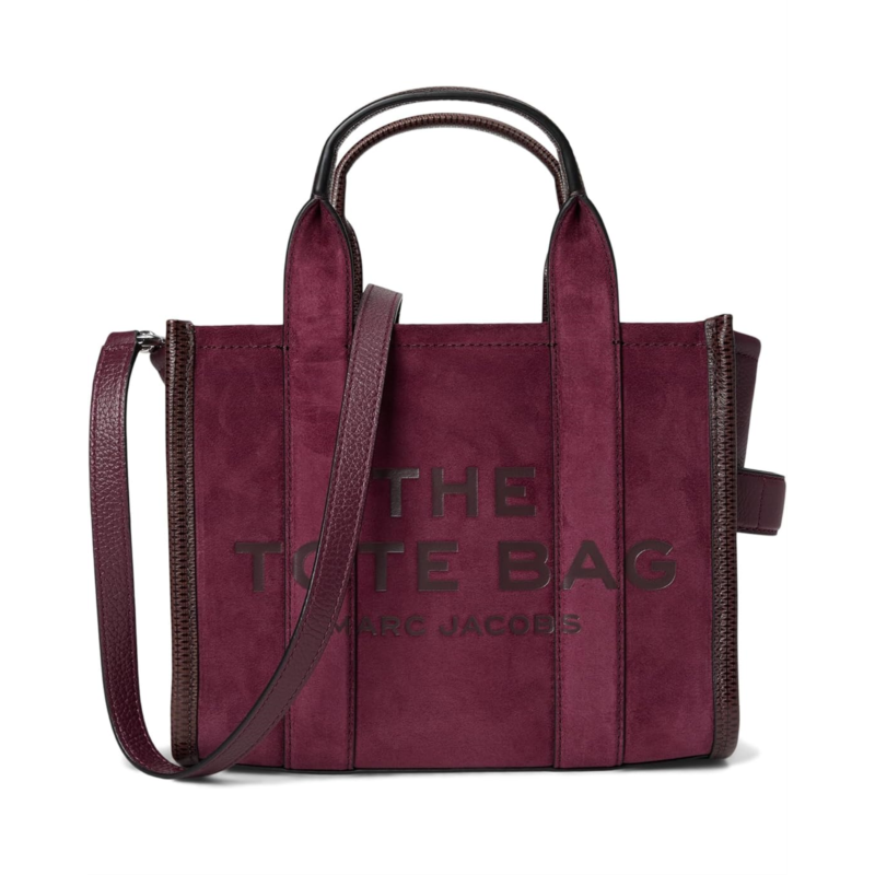 - The Marc Jacobs The Suede Small Tote Bag perfectly balances texture, function, and sophistication. It features debossed branding, dual handles, and a zippered top closure for secure storage. The spacious interior has a zippered pocket to organize essentials, while the removable, adjustable leather strap allows for versatile styling.
