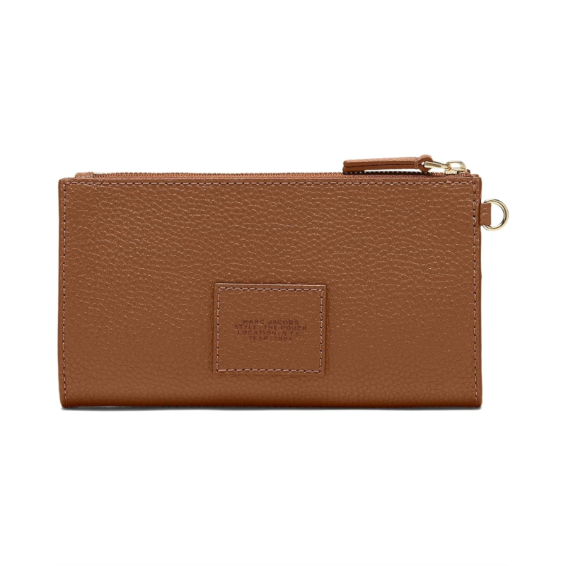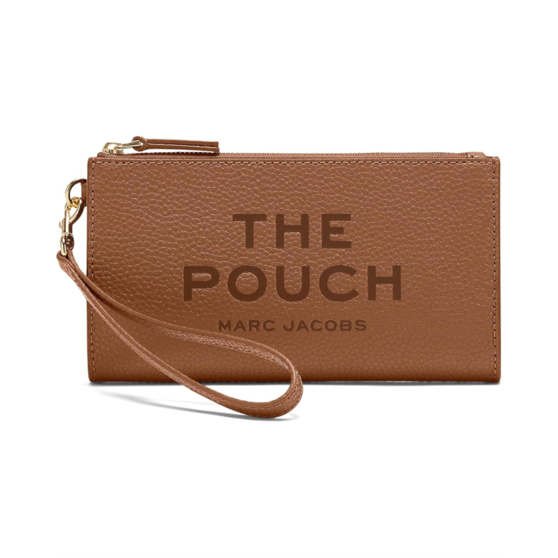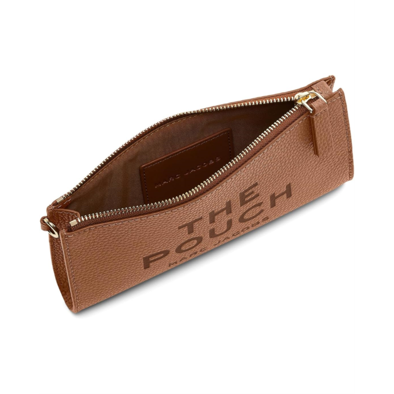- The Marc Jacobs The Leather Pouch displays elegance and easily stores all your small essentials. Made with split cow leather with polyurethane coating, it ensures durability and offers convenience with an easy zipper closure. The signature branding on the front adds a touch of authenticity and the detachable carry strap allows easy carrying.