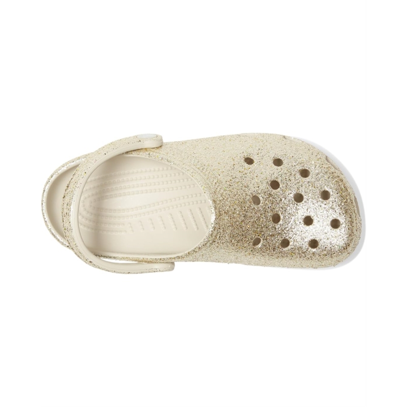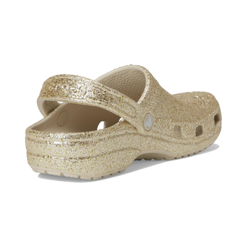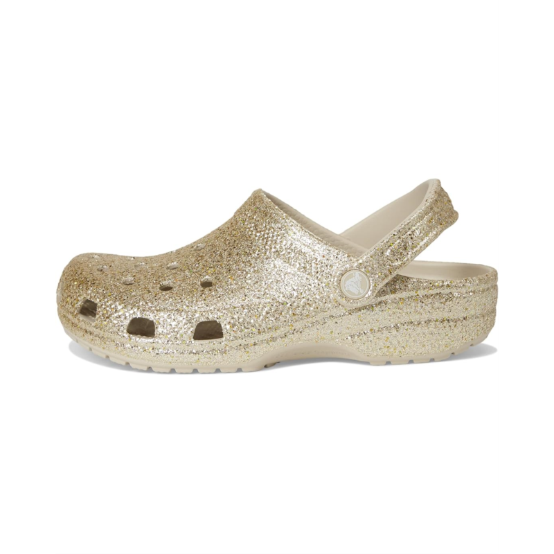 - Experience lightweight 360-degree comfort and good flexibility wearing Crocs Kids Classic Glitter Clogs, that perfectly accent your little ones outfits with their sparkly detailing. The waterproof clogs are expertly crafted with an ethylene vinyl acetate upper with holes for breathability, ethylene vinyl acetate insole, and slingback strap for a secured fit.