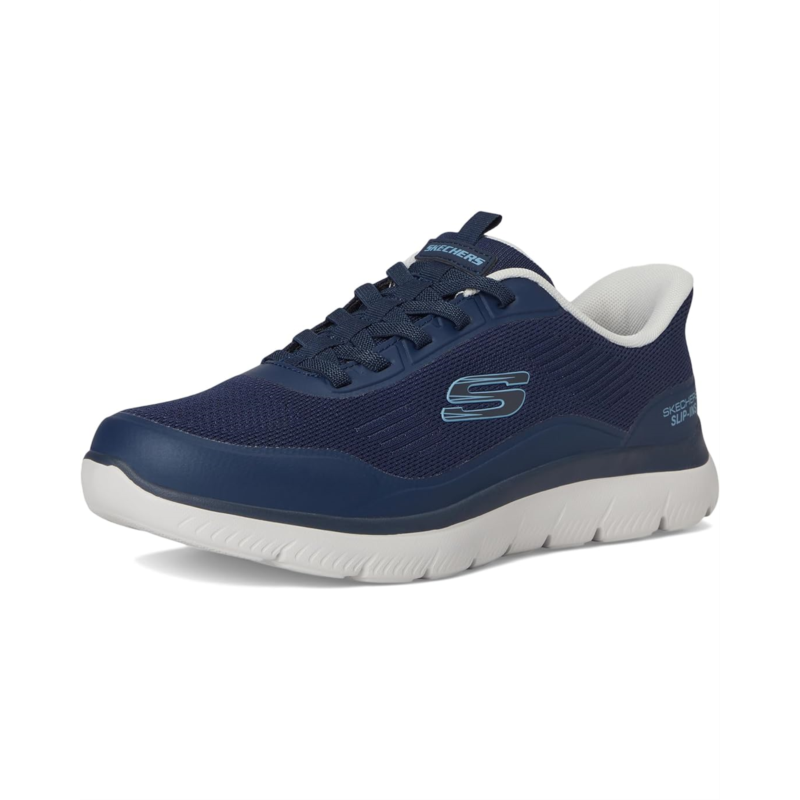 - Step into the easy-wearing comfort of the SKECHERS Summits Leyter Hands Free Slip-in. Designed with our exclusive Heel Pillow, which holds your foot securely in place, this slip-on style features a 3D hotmelt engineered knit upper with stretch laces and Skechers Air-Cooled Memory Foam cushioned comfort insole. Throw this vegan style in the washing machine for a clean look.