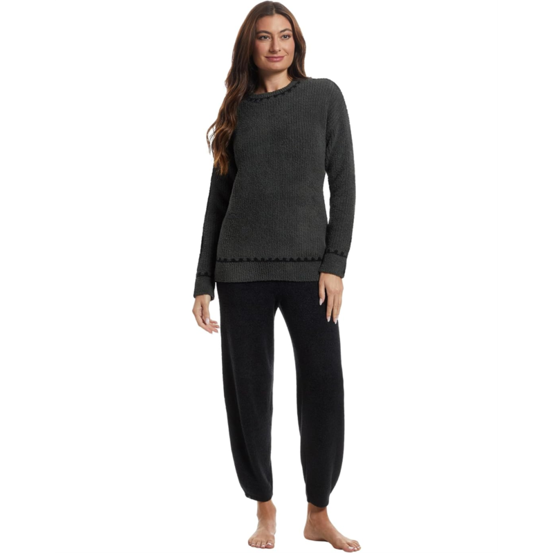 - Classic comfort with a handcrafted twist - our Barefoot Dreams Cozychic Ribbed Sweater With Blanket Stitch adds artisanal detail to your everyday knitwear collection. This relaxed pullover features an all-over ribbed texture and lands at the low hip for an easy, flattering fit that layers beautifully. Thoughtfully finished with a ribbed crew neckline and standout blanket stitch jacquard detailing at the collar, sleeve openings, and hem, this sweater blends timeless design with cozy sophistication.