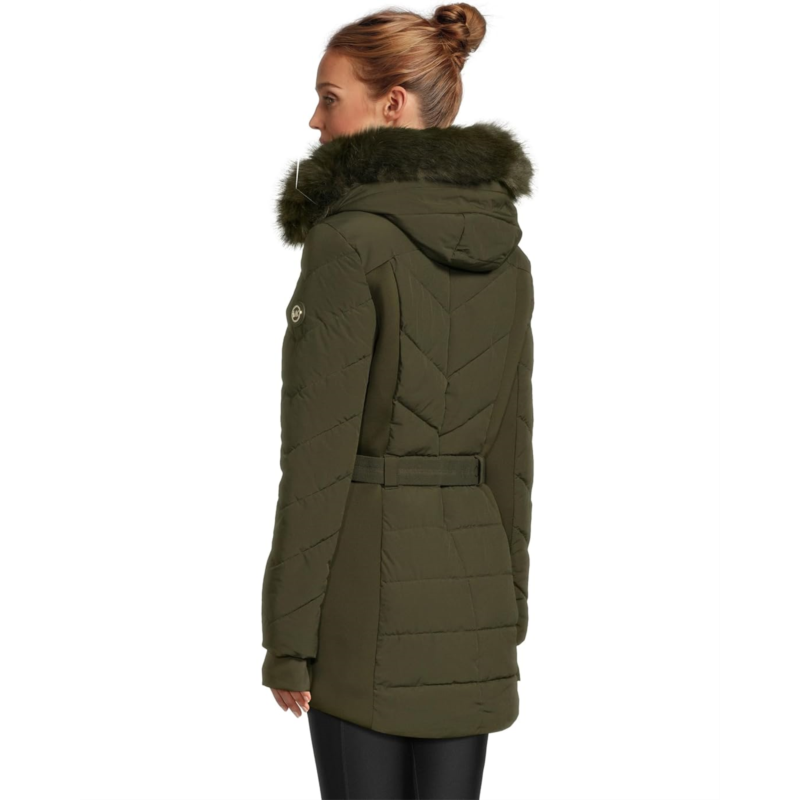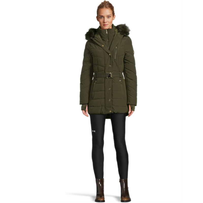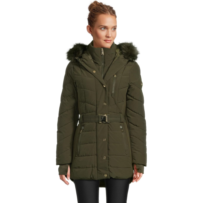 Warm and chic. Be ready for chilly weather days in the MICHAEL Michael Kors Chevron w/ Belt A421509B74. Featuring a front zipper closure with a snap-closure storm flap, attached hood, long sleeves, thumbholes, zipper chest pocket, and zipper hand pockets.