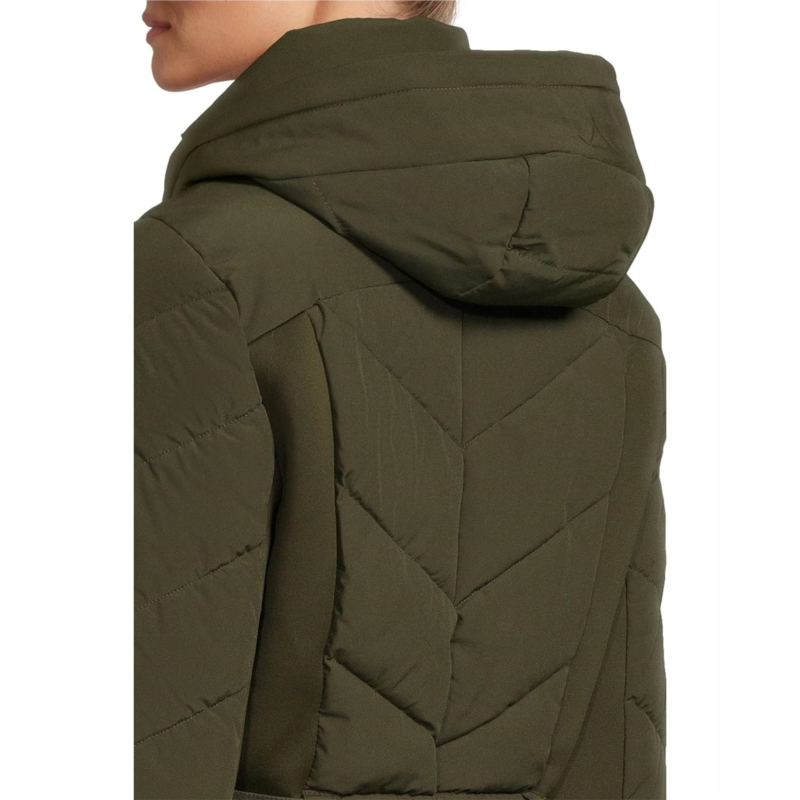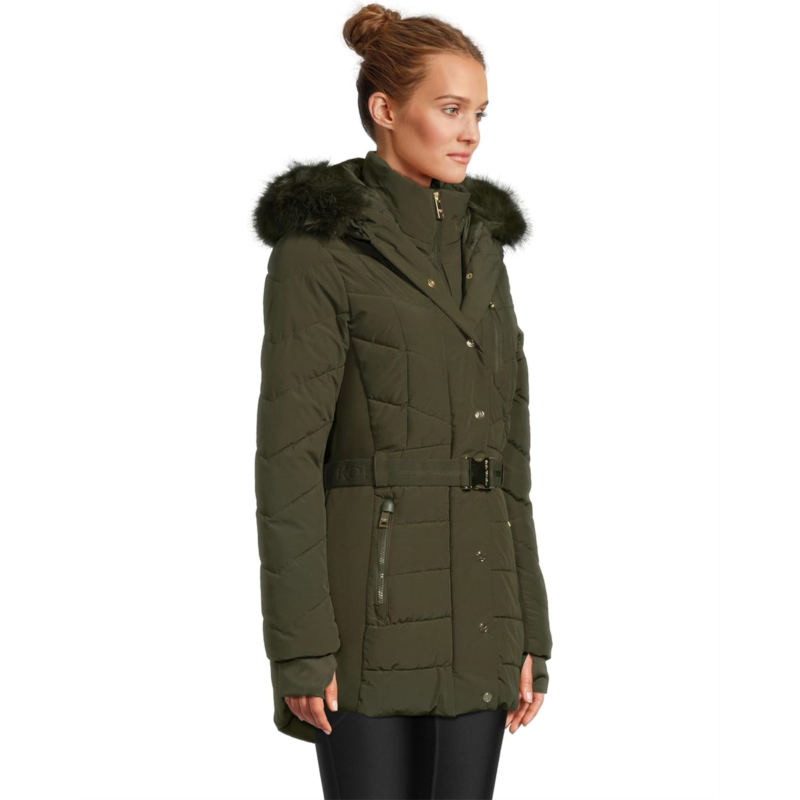 Warm and chic. Be ready for chilly weather days in the MICHAEL Michael Kors Chevron w/ Belt A421509B74. Featuring a front zipper closure with a snap-closure storm flap, attached hood, long sleeves, thumbholes, zipper chest pocket, and zipper hand pockets.