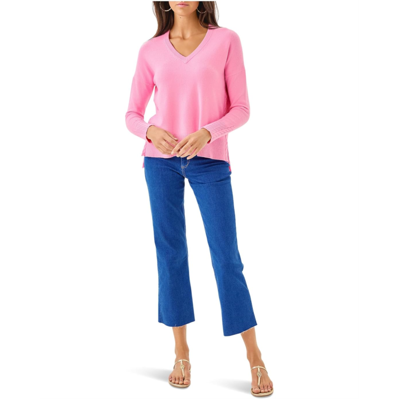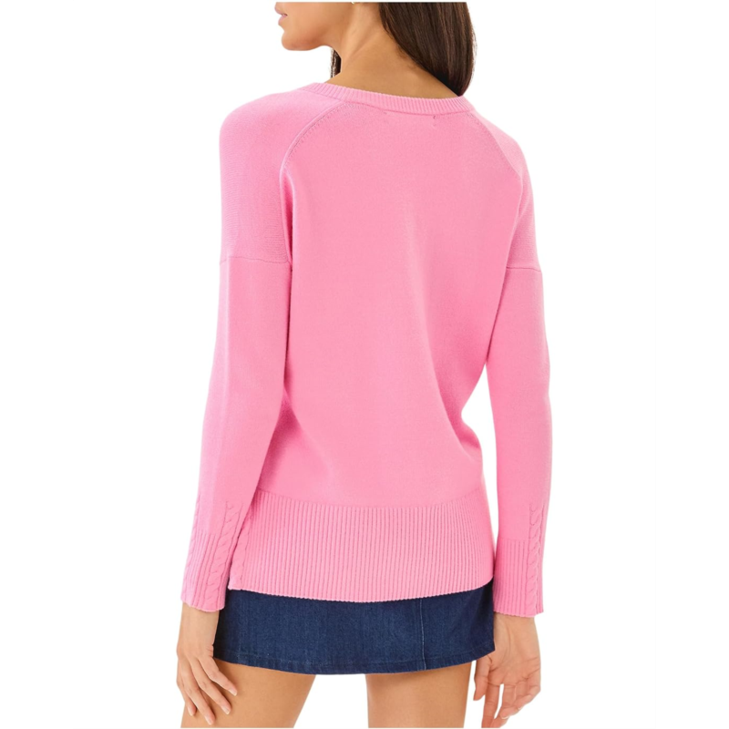 - The Lilly Pulitzer Laureen Sweater brings a touch of relaxed sophistication to those who value chic, comfortable style. Featuring a regular, relaxed fit, this long-sleeve V-neck pullover is perfect for layering or wearing solo on cooler days. The pull-on design ensures easy, breezy styling, while the high/low hem adds a modern twist to a classic silhouette. Delight in the placed cable stitch details along the side seams and sleeves, giving subtle texture and visual interest that elevates your everyday look. The drop shoulder design enhances the laid-back vibe, offering effortless movement and comfort all day long.