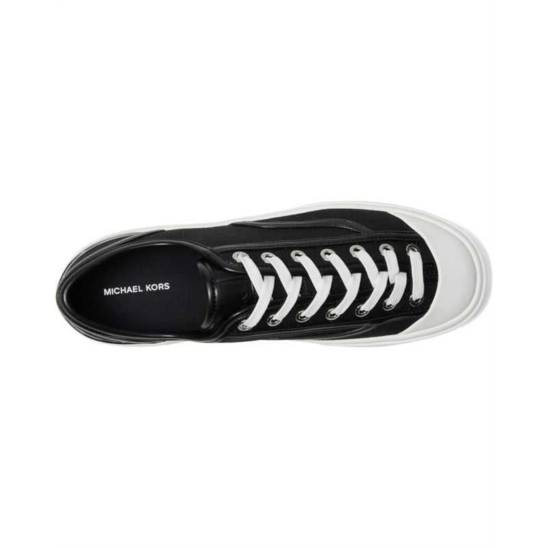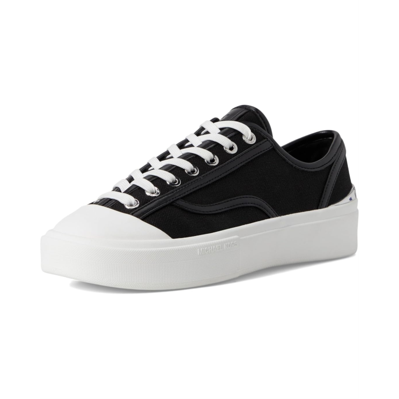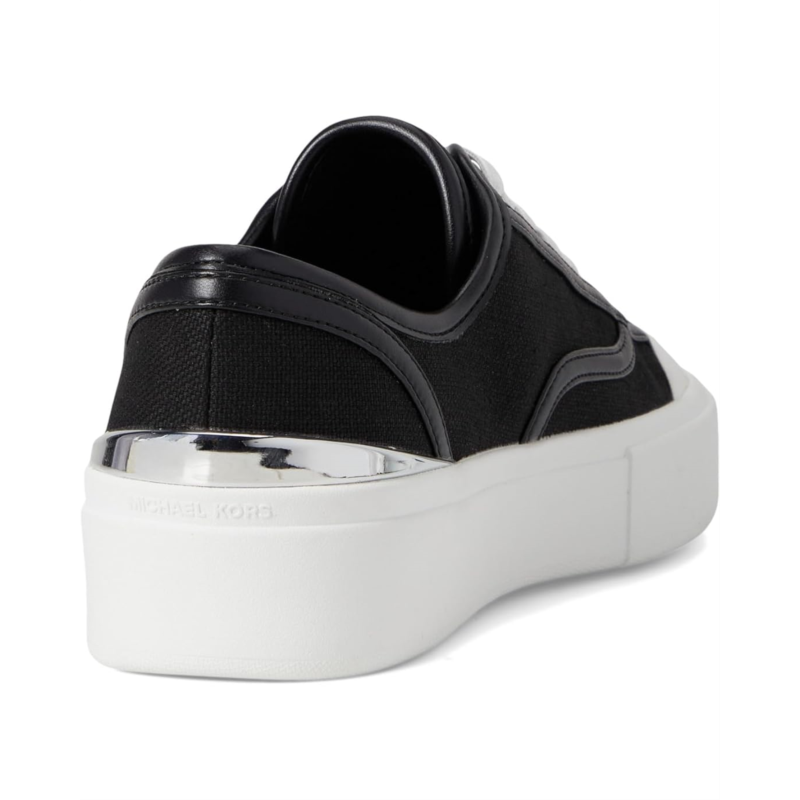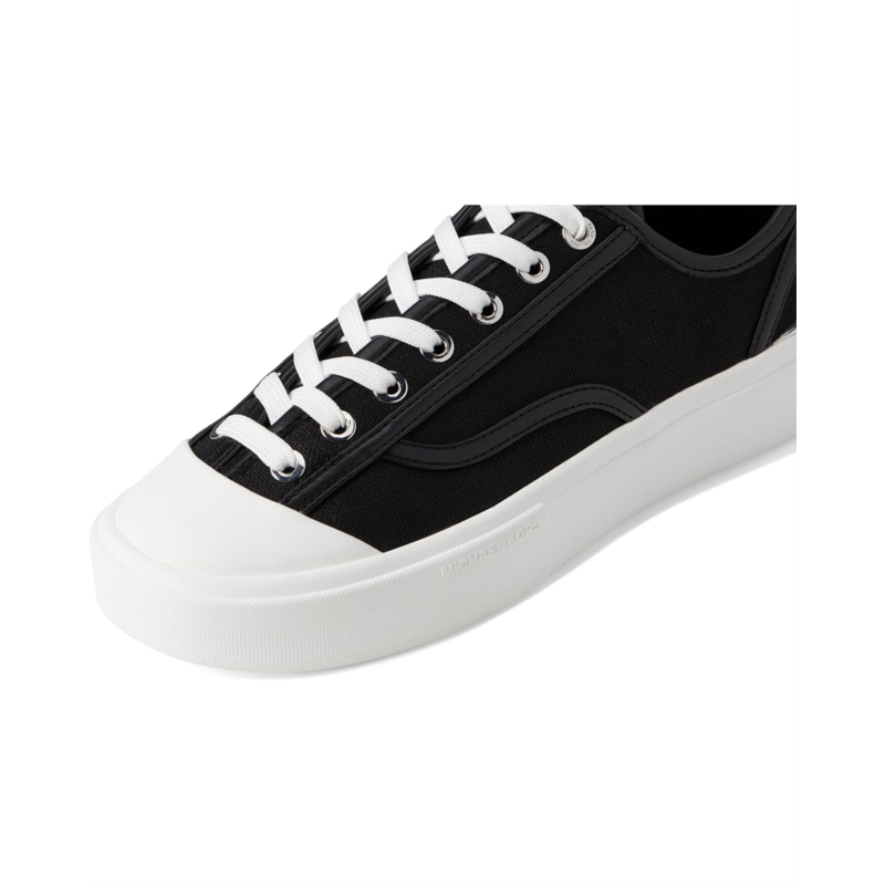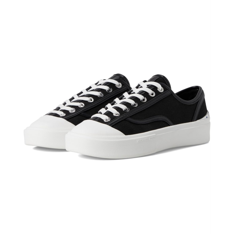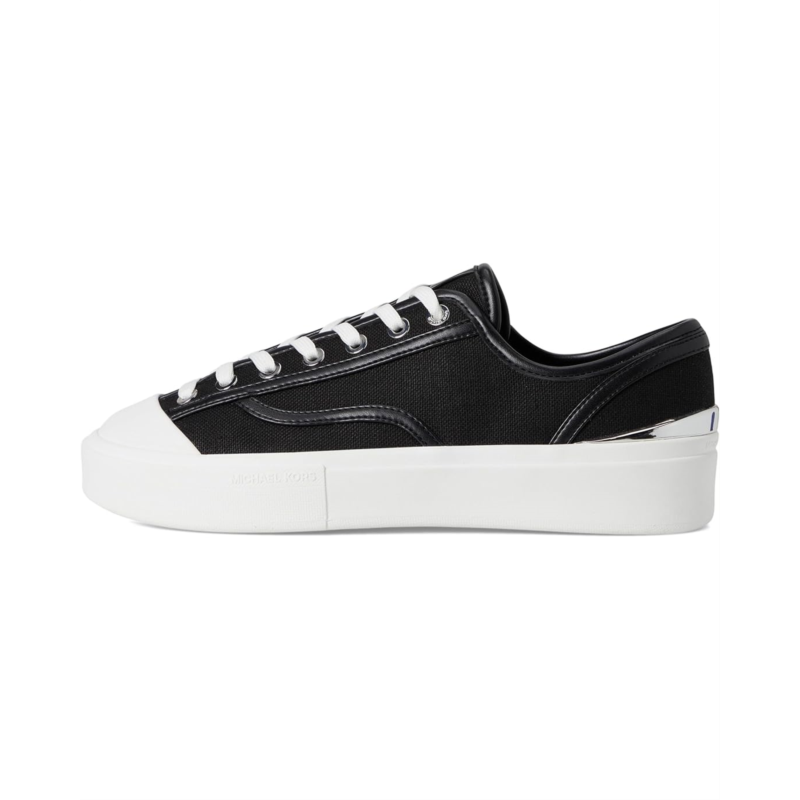Michael Kors Jude Lace-up is inspired by vintage military trainers modernized through an elongated eyestay design with premium eyelets and lace up front. The rubber toe cap and clean rubber cupsole provide excellent durability and comfort. The low-top sneakers feature canvas upper with leather trimming, cotton lining, rubber insole, and round toes.