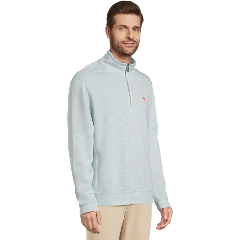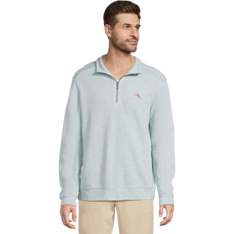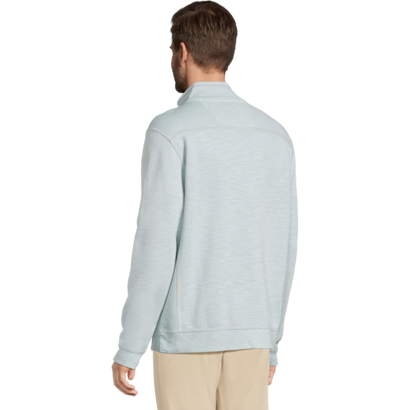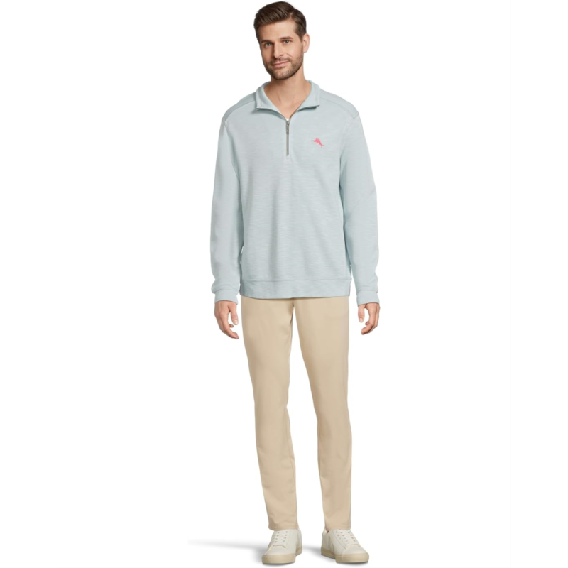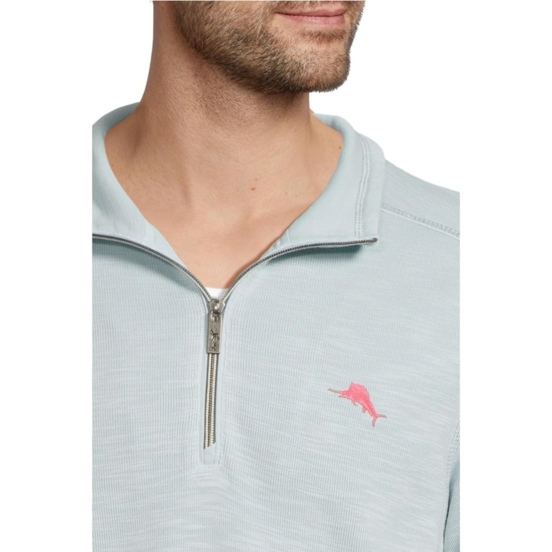 Thoughtfully designed with the modern man in mind, the Tommy Bahama Tobago Bay Half Zip is more than just an outerwear. This slubbed texture shirt features stand collar neckline with zippered closure, long sleeves, contrast top stitching details, brand logo on the left chest, and straight hem.