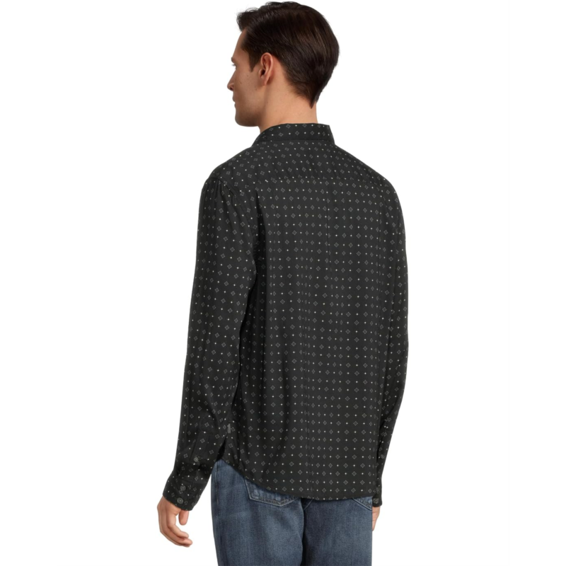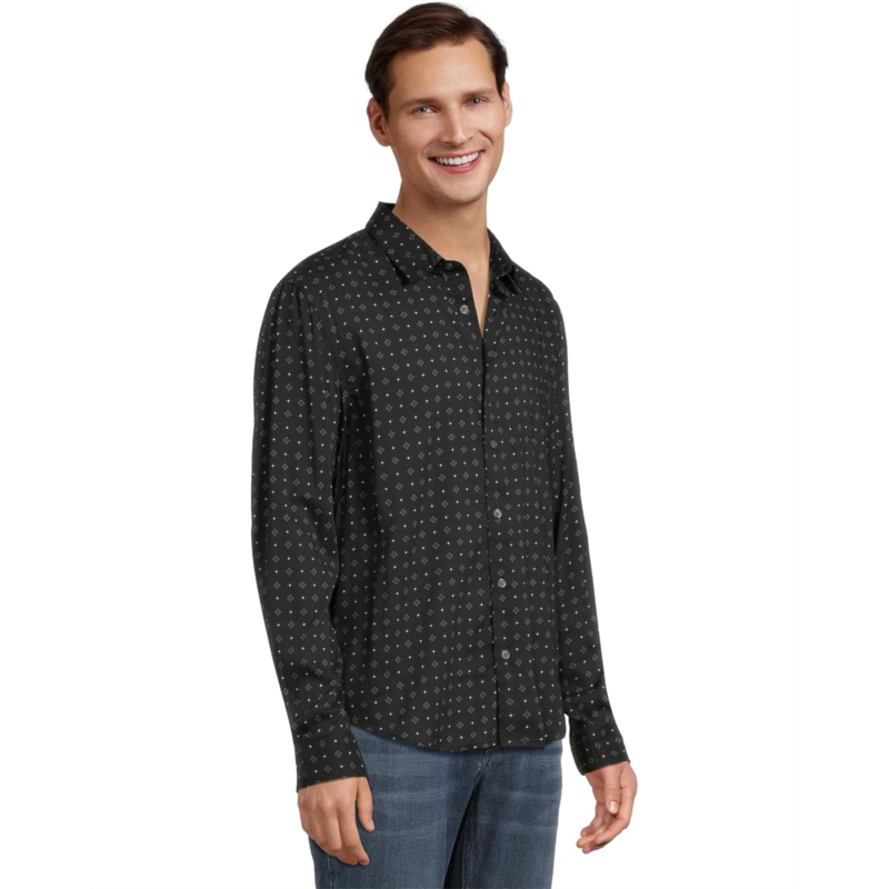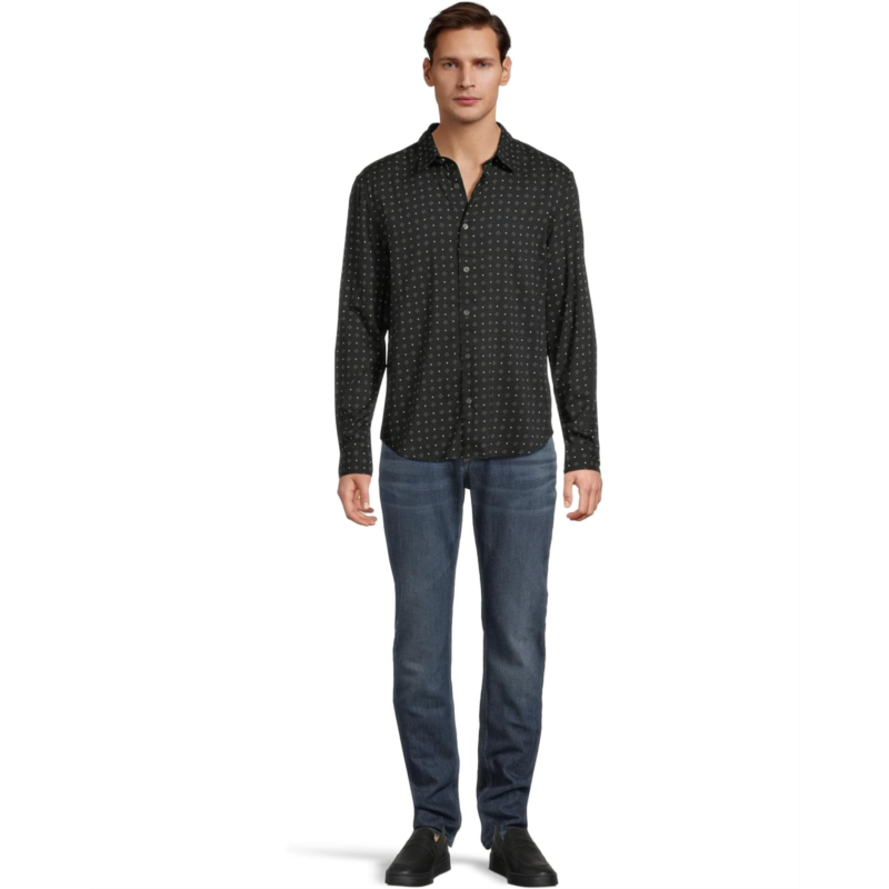 The John Varvatos Luca Shirt W985W25 is cut in a soft, drapey linen that offers ease and light structure. A watercolor base layered with a damask overprint creates nuanced visual depth, while the button-up placket and slim fit add a refined, tailored edge.
