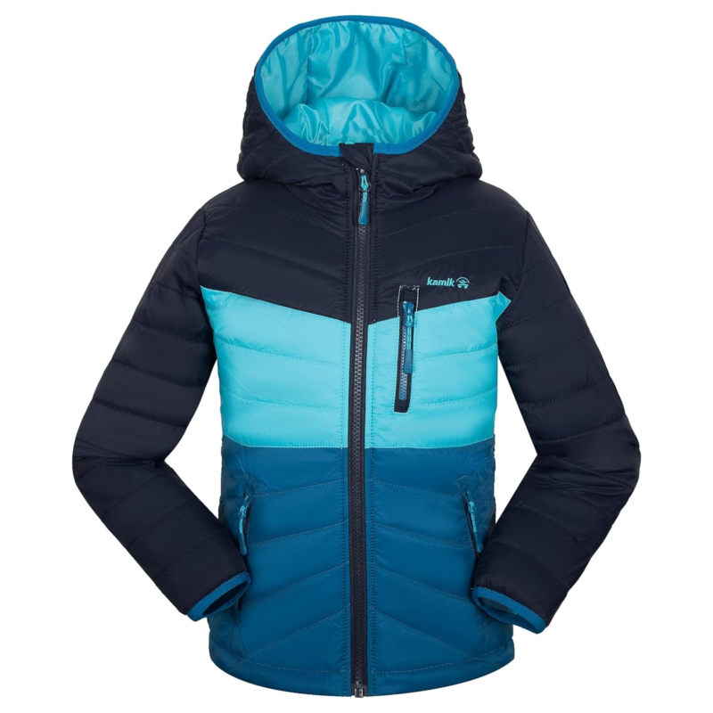 Add a dose of color to your warm-weather look wearing the Kamik Kids Harley Quilted Jacket. It has waterproof, breathable construction and has a bionic finish eco water repellant coating. The jacket has reflective details for safety and features an attached hood with a zippered front closure, long sleeves, and a straight hem.