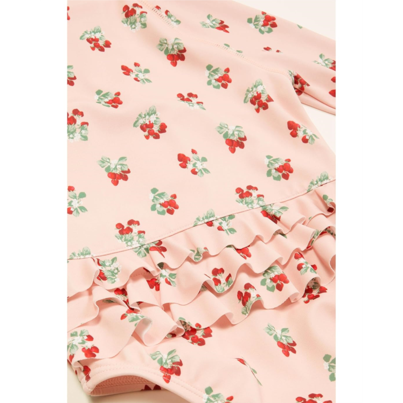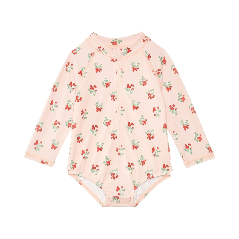 Give your little one the soft touch of comfort and make her look cute wearing Janie and Jack Strawberry One-Piece Swimwear. The swimwear features a mock neck, long sleeves, ruffle detail on the back, front-zipper closure, and allover fruit print.