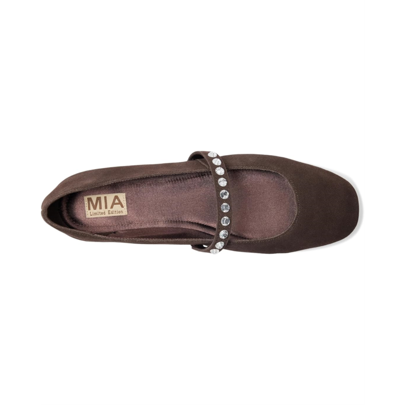 - Bringing the ballet flat trend to life. MIA MLE-Karolin is crafted on authentic suede material; a satin insole lining, and also features a rhinestone Mary-Jane strap for a chic look. Shes your new go-to flat for the season.