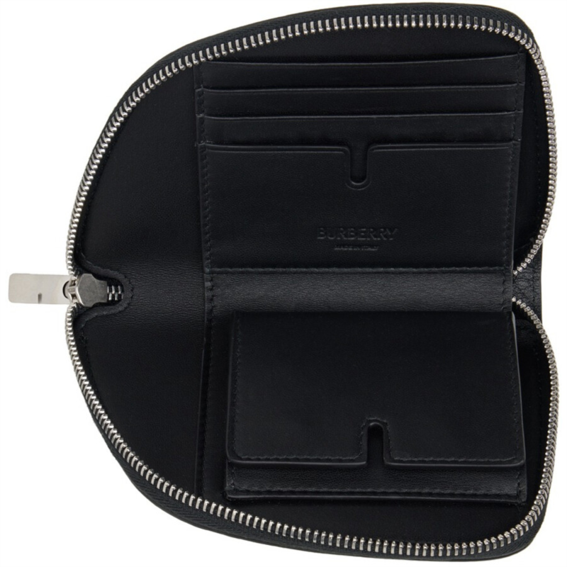 Burberry Men''s Wallets. SKU: 8080698. Barcode: 5045704981908. Color: Black. Burberry Medium Shield Zip Wallet. Crafted from grainy leather, this wallet features a folded shield shape with four card slots, a note compartment, and a press-stud coin compartment. It has a zip closure with a B-cut zip pull and is finished with an embossed Equestrian Knight design. 100% leather. Made in Italy.