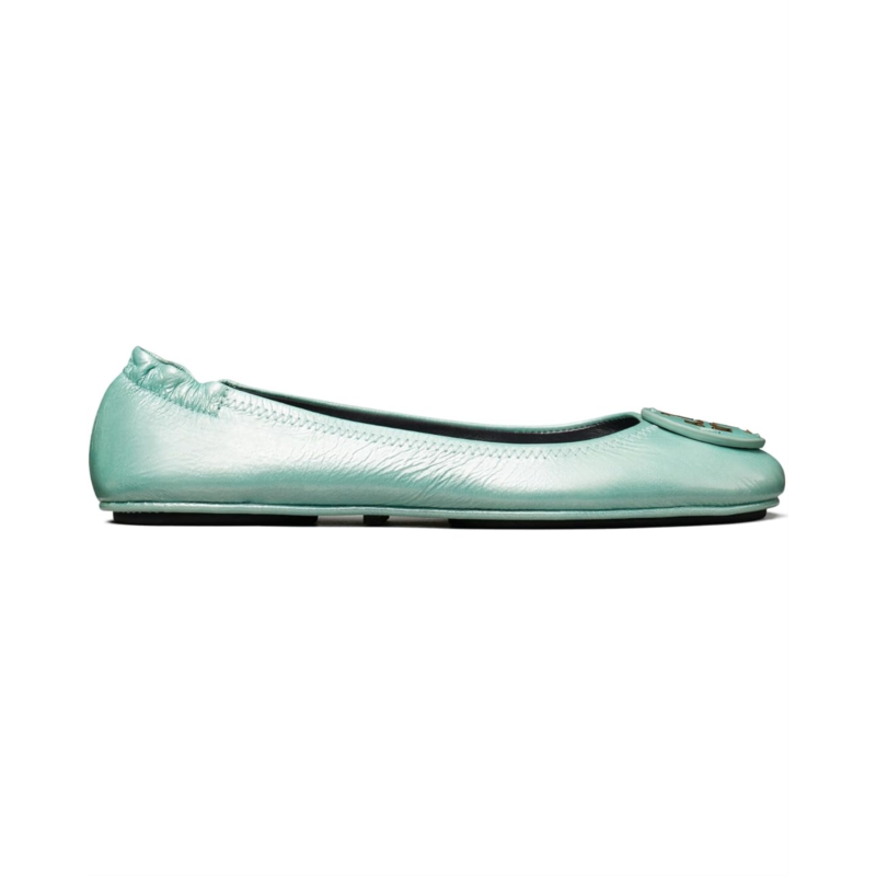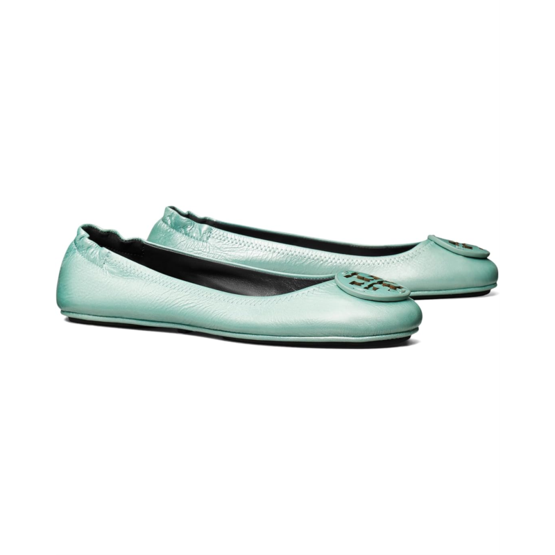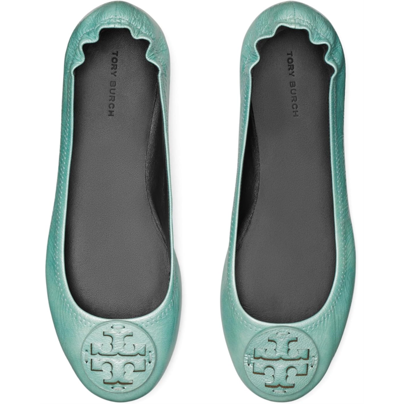 - The Tory Burch Minnie Travel Ballet w/ Metal Logo flat is crafted in leather, featuring a leather logo detail, and a packable design that makes traveling in style a breeze.