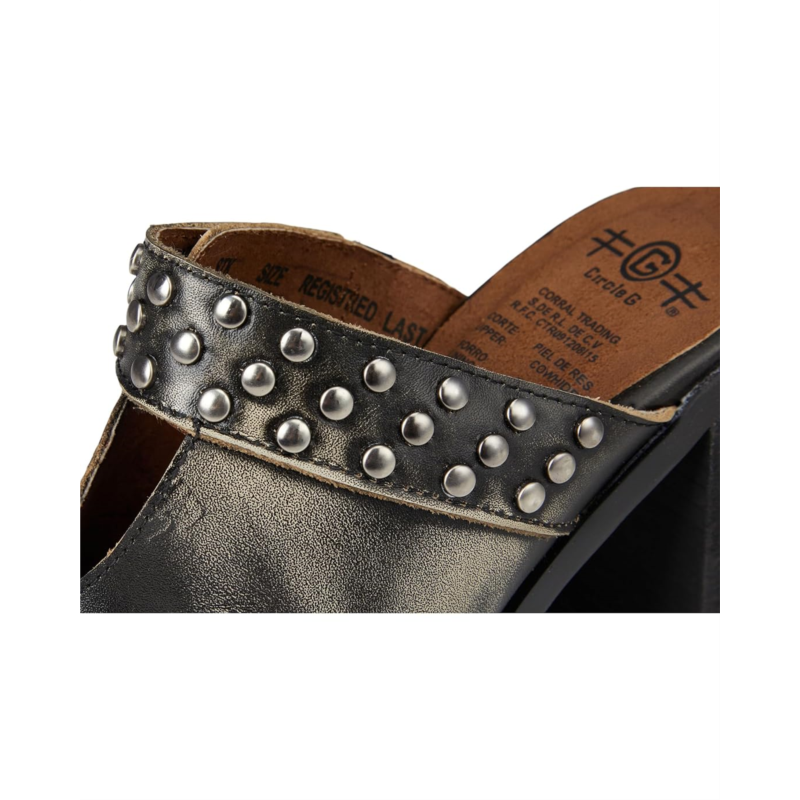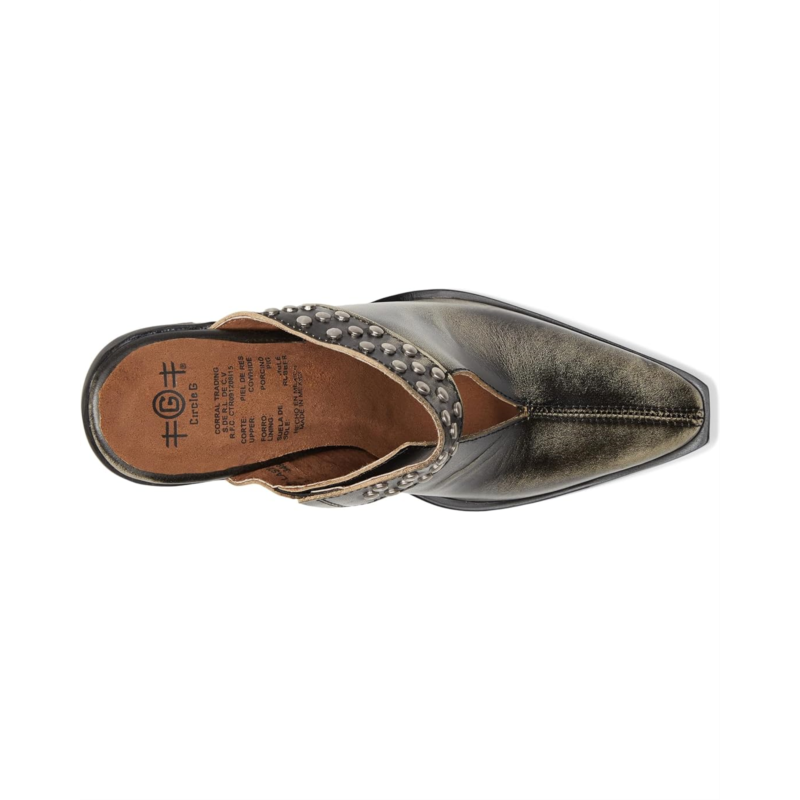 - Stand out from the crowd in style wearing the Corral Boots Lady Studs Mules. Crafted with distressed leather upper featuring intricate stud detailing, these mules are the perfect blend of rugged and refined. The leather lining and insole provide luxurious comfort, while the block heels offer a stable and trendy lift.