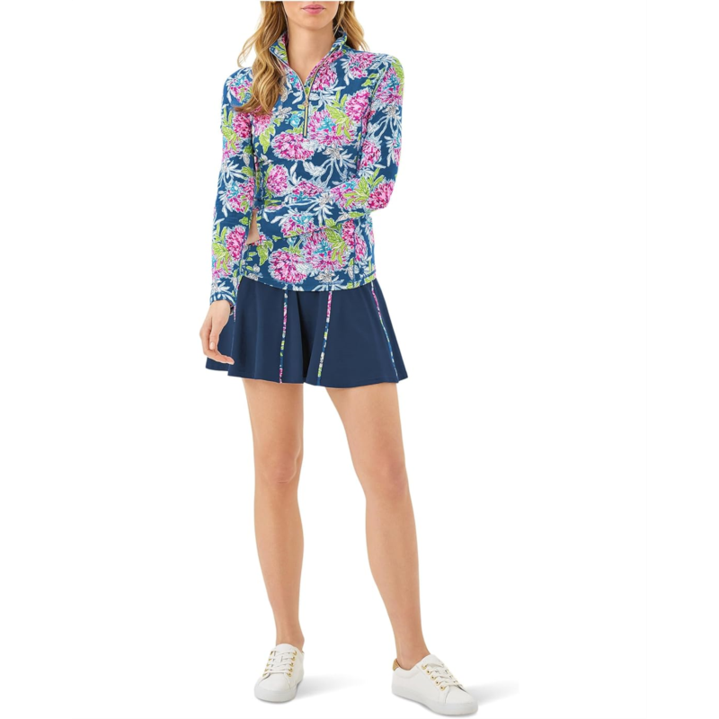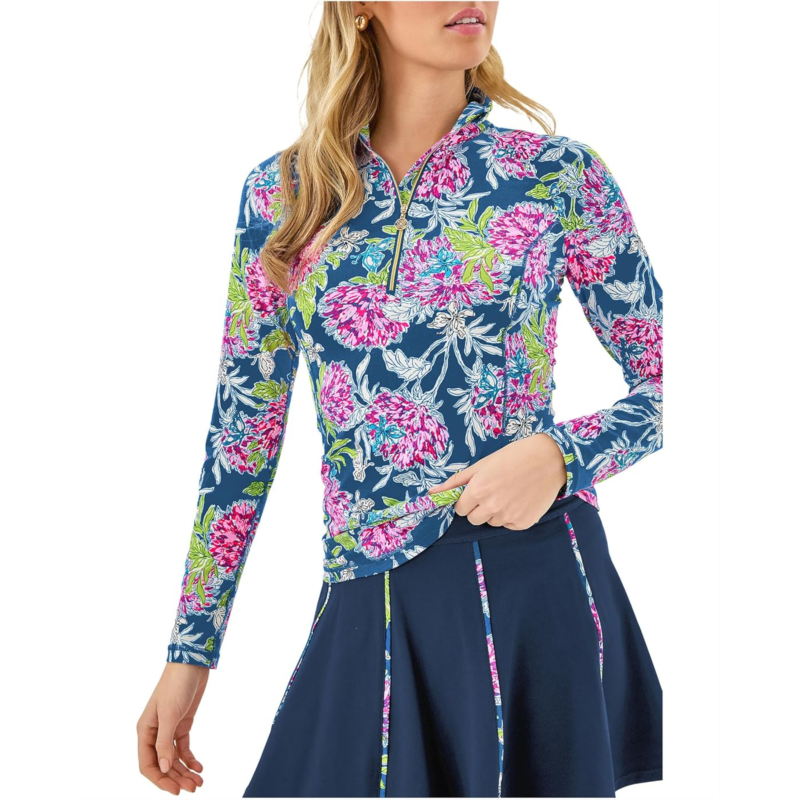 - Pair your sports shoes for outdoors by getting this modern Lilly Pulitzer Justine Half Zip Upf 50+ top. The high collar spreads when open through half-front zip. The skinny-fit top has long sleeves and a shirttail hem. An allover floral print makes it outstanding. The top features shirring on the shoulder. Moisture-wicking construction keeps you dry throughout the day.