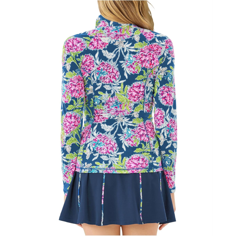 - Pair your sports shoes for outdoors by getting this modern Lilly Pulitzer Justine Half Zip Upf 50+ top. The high collar spreads when open through half-front zip. The skinny-fit top has long sleeves and a shirttail hem. An allover floral print makes it outstanding. The top features shirring on the shoulder. Moisture-wicking construction keeps you dry throughout the day.
