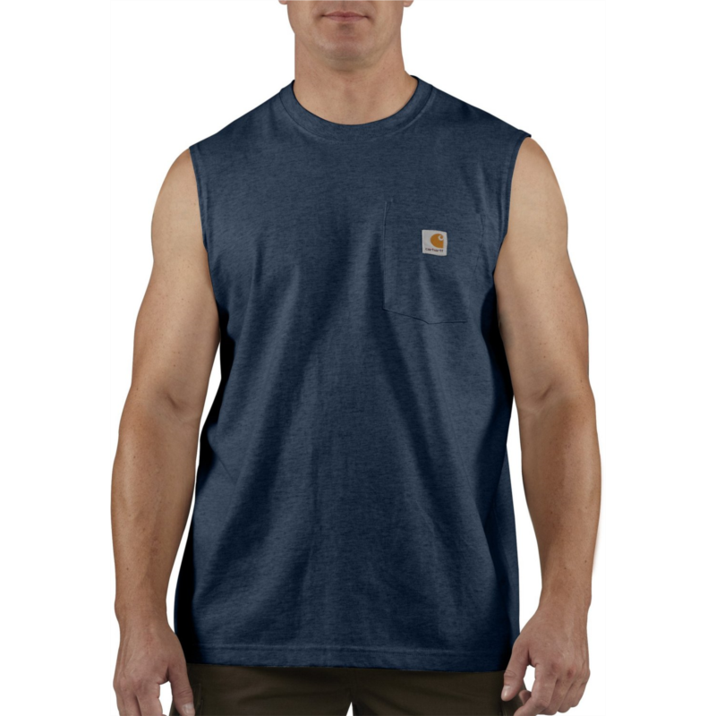 Designed for comfort and durability, the Carhartt Mens Workwear Pocket Sleeveless T-shirt is great in warm weather or as an extra layer on cooler days. The T-shirt is made of durable 100% cotton jersey knit or 90% cotton and 10% polyester (heathered) and features a crew neck with a tagless label to help minimize irritation. Clean-finished, side-seam construction for comfort and minimal twisting. Left chest utility pocket with a Carhartt logo. Relaxed fit. Made of durable 100% cotton jersey knit or 90% cotton and 10% polyester (heathered)