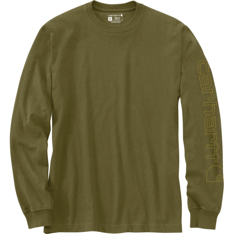 Great for keeping you warm on the job site, the Carhartt Mens Long Sleeve Graphic Logo T-shirt is made of 100% cotton knit jersey for a soft feel and comfortable wear and features rib-knit cuffs and a rib-knit crew neck with a tagless neck label. Side-seam construction helps to minimize twisting. Carhartt logo printed on the left sleeve. 100% cotton jersey knit for a soft feel and comfortable wear