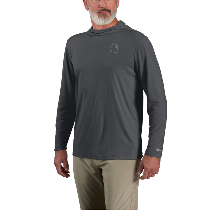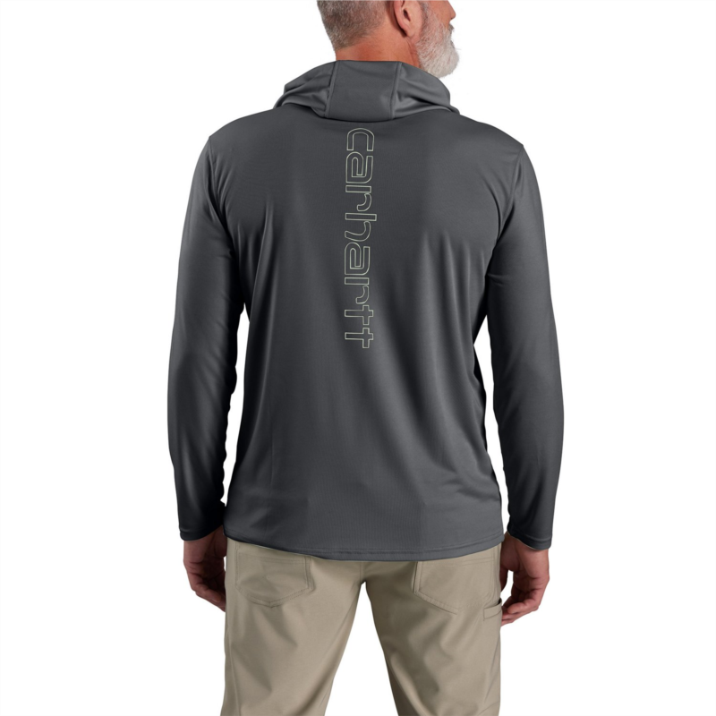 Remain cool and protected while you work in the Carhartt Mens Force Sun Defender Lightweight Hooded Long Sleeve T-shirt. The polyester fabric is stretchy and wicks away moisture for all-day comfort. The Carhartt branding adds a stylish touch. 100% polyester jersey construction provides comfort and durability