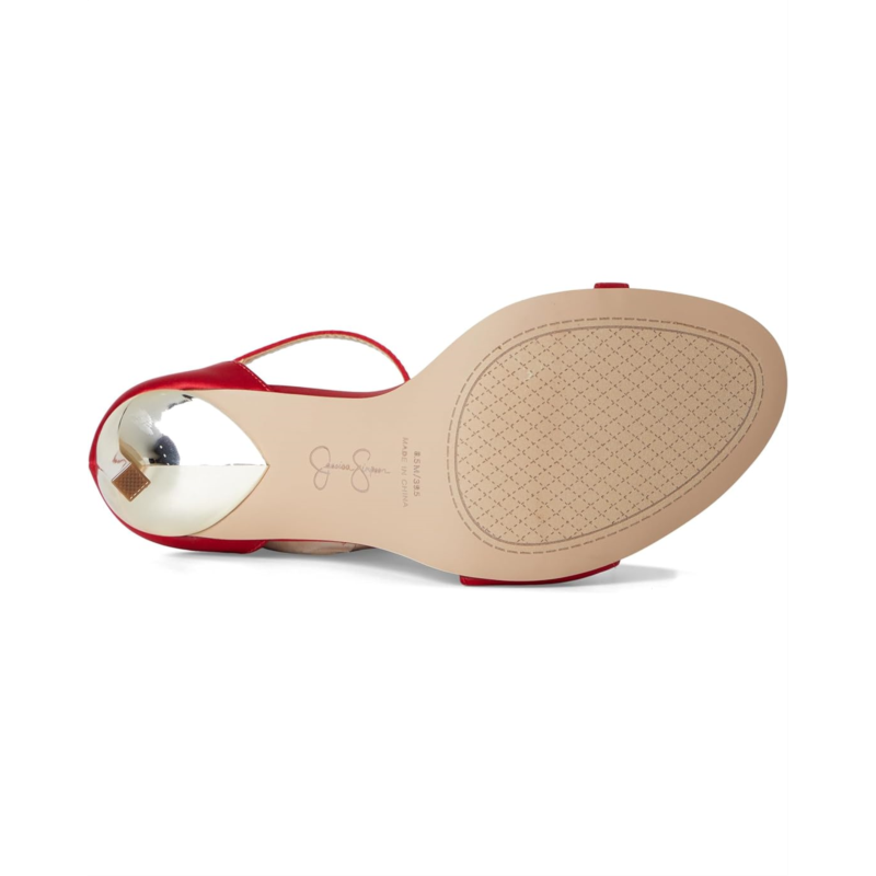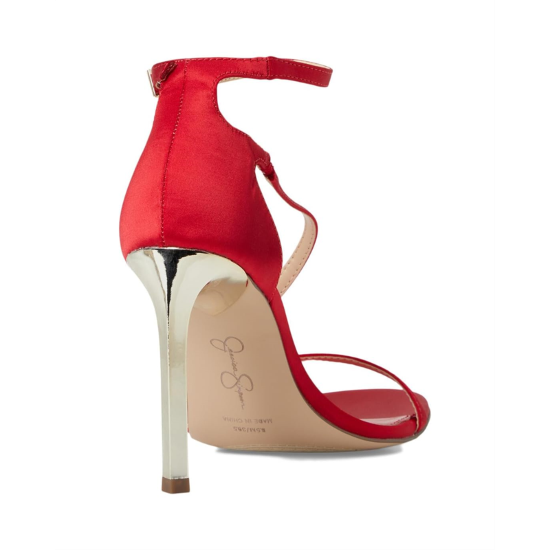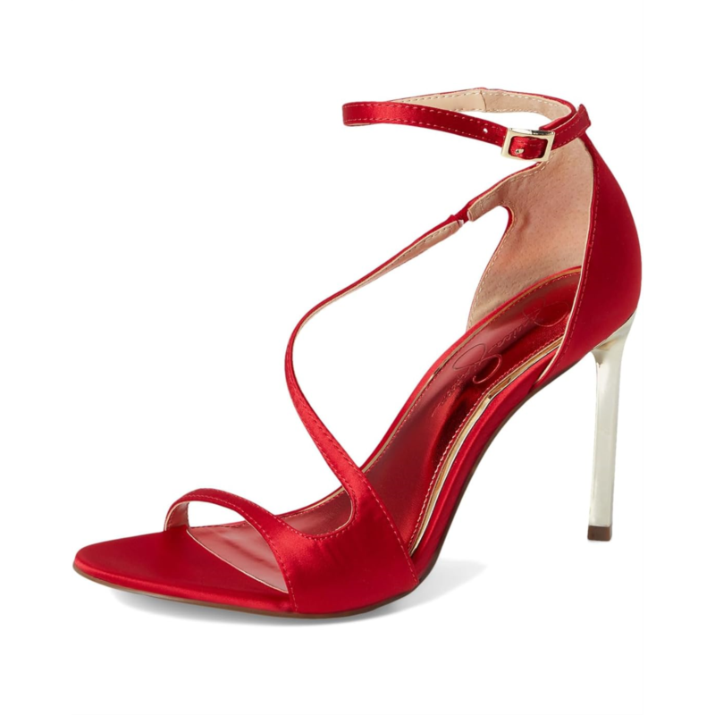 - Styled with an asymmetrical strap design for an eye-catching appeal, make a stylish entry into a party or event wearing the Jessica Simpson Qamille Asymmetrical High Heel Sandals. These heeled sandals are made of a cushioned insole and synthetic lining. The crinkle patent synthetic upper has an ankle strap with buckle closure for added support. Whether you''re dressing up for a fashion event or a formal event, these sandals are a great choice.