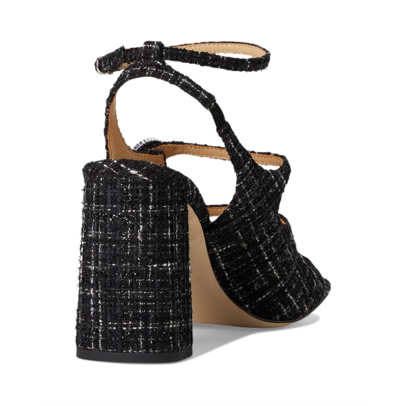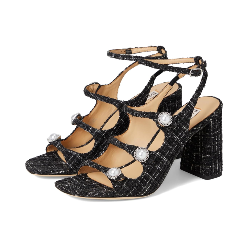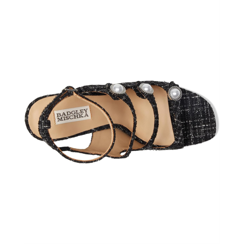 - Crafted with a tweed fabric upper and adorned with pearl embellishments, the Badgley Mischka Vella block heels blend elegance with playful charm. The buckle adjustable ankle strap and caged silhouette offer a flattering fit, while the open square toe design provides charming flair.