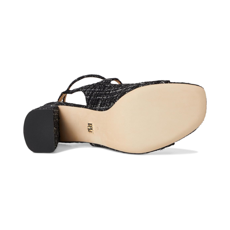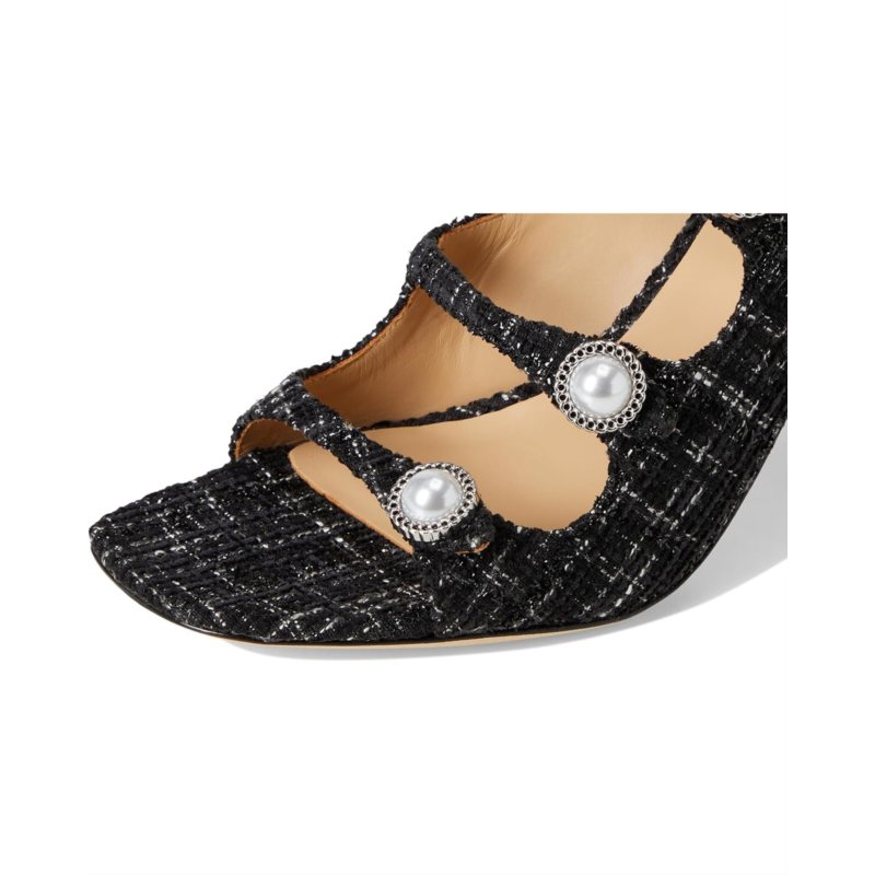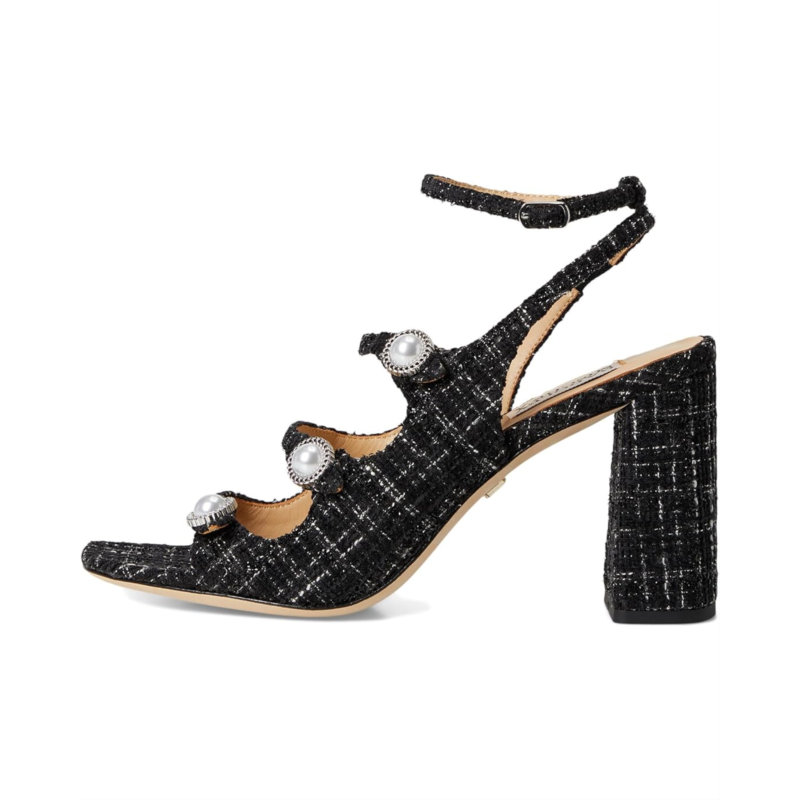 - Crafted with a tweed fabric upper and adorned with pearl embellishments, the Badgley Mischka Vella block heels blend elegance with playful charm. The buckle adjustable ankle strap and caged silhouette offer a flattering fit, while the open square toe design provides charming flair.
