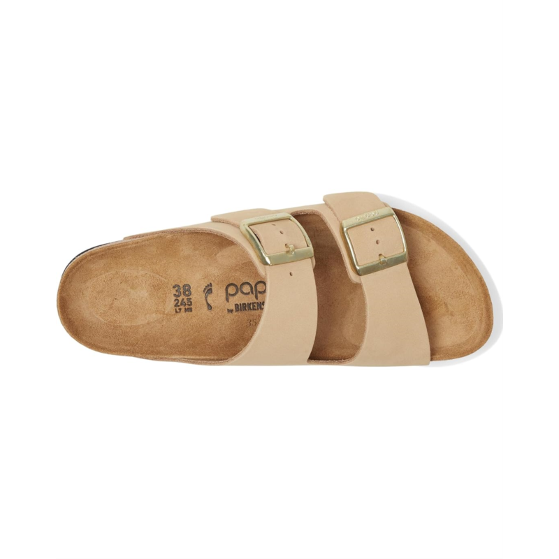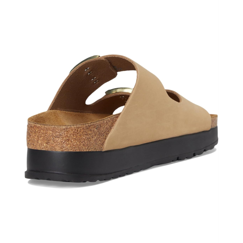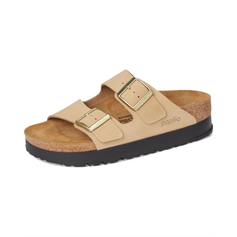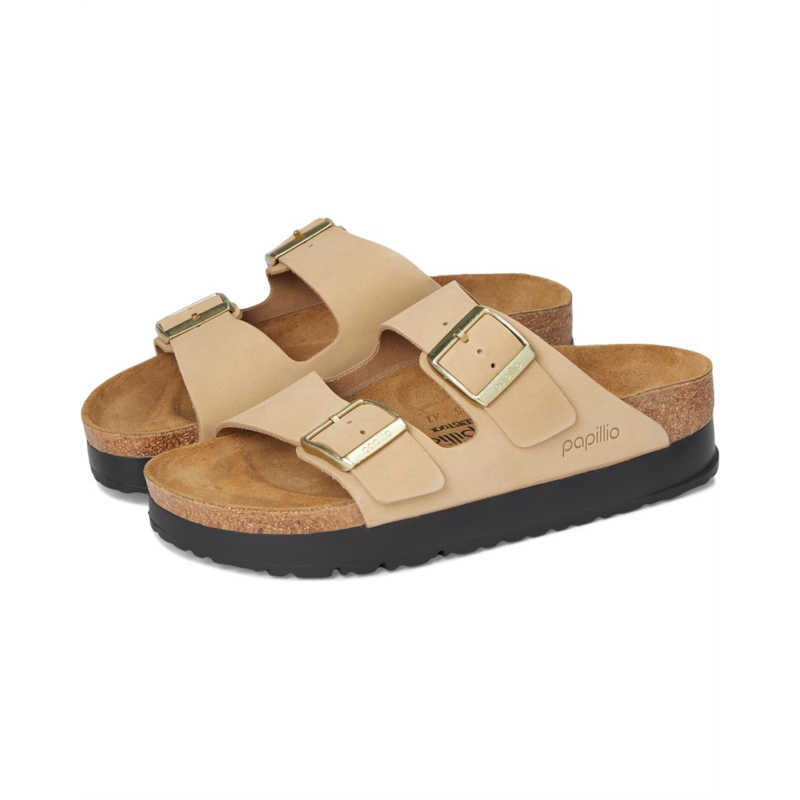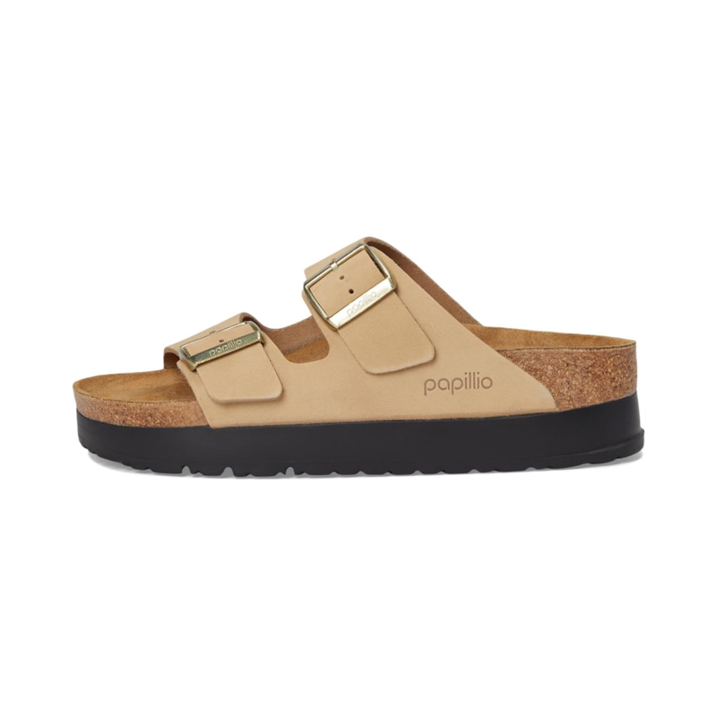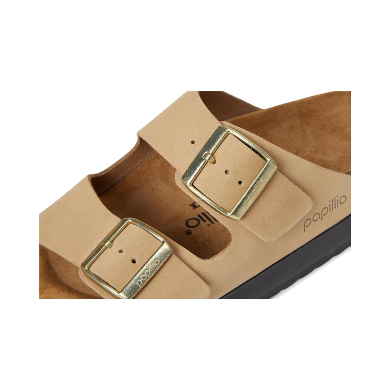 - Elevate your fashion altitude with Birkenstock Papillios Arizona Platform Sandal in Nubuck. Unveiling a daring platform sole, this iconic design soars to new heights while embracing its classic roots in luxurious nubuck leather. The contoured cork-latex footbed ensures personalized support, complemented by two adjustable straps featuring metal pin buckles for a perfect fit.