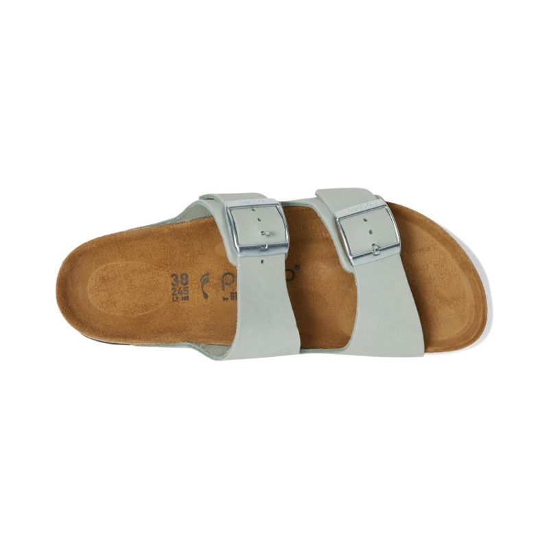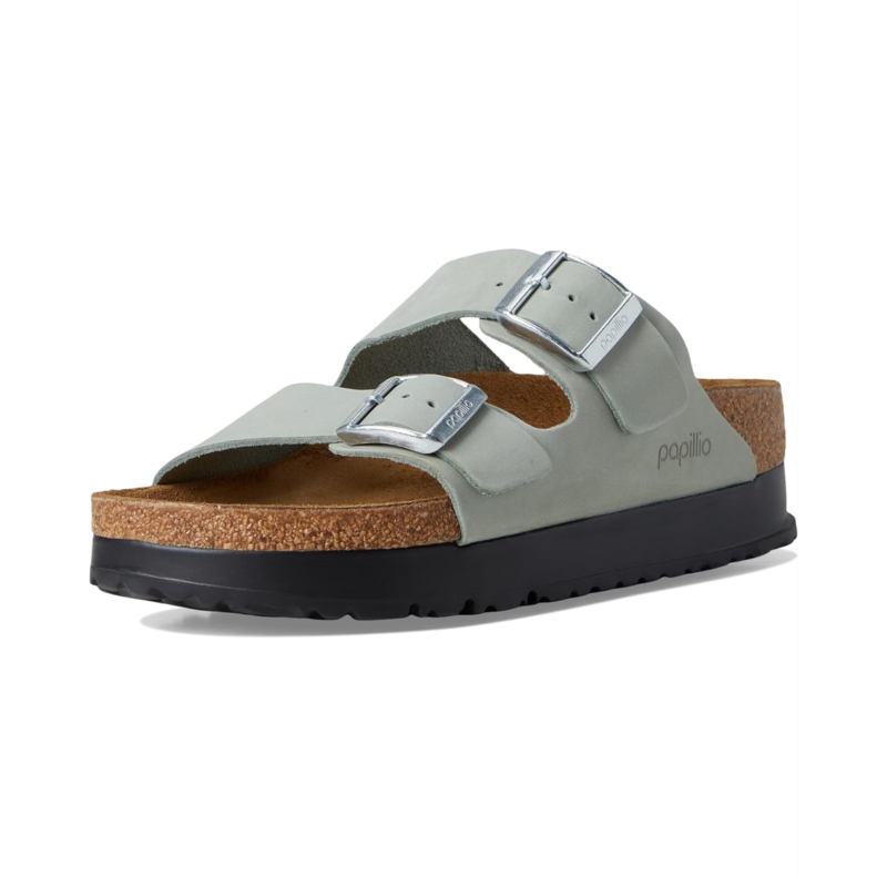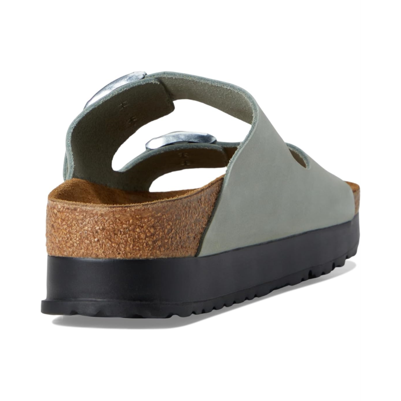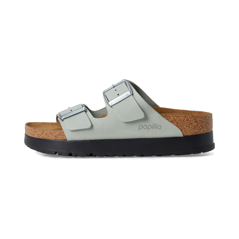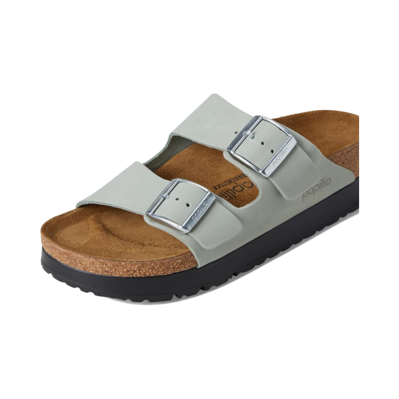 - Elevate your fashion altitude with Birkenstock Papillios Arizona Platform Sandal in Nubuck. Unveiling a daring platform sole, this iconic design soars to new heights while embracing its classic roots in luxurious nubuck leather. The contoured cork-latex footbed ensures personalized support, complemented by two adjustable straps featuring metal pin buckles for a perfect fit.