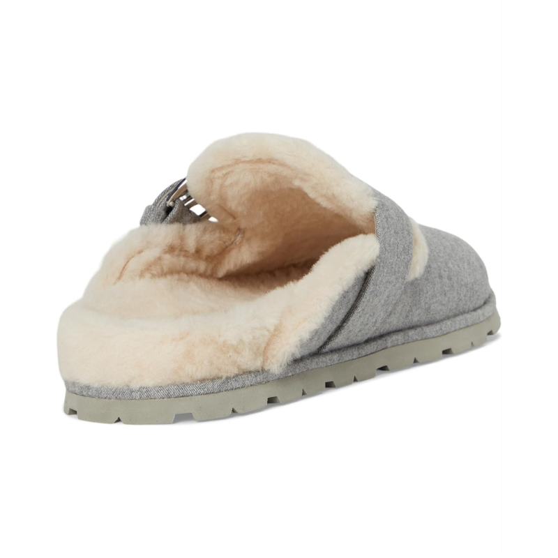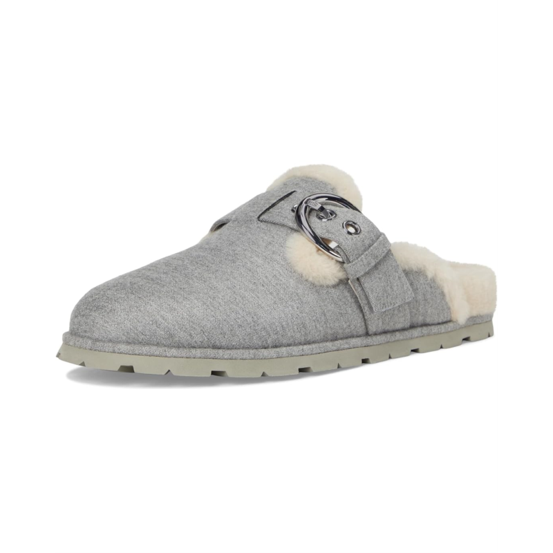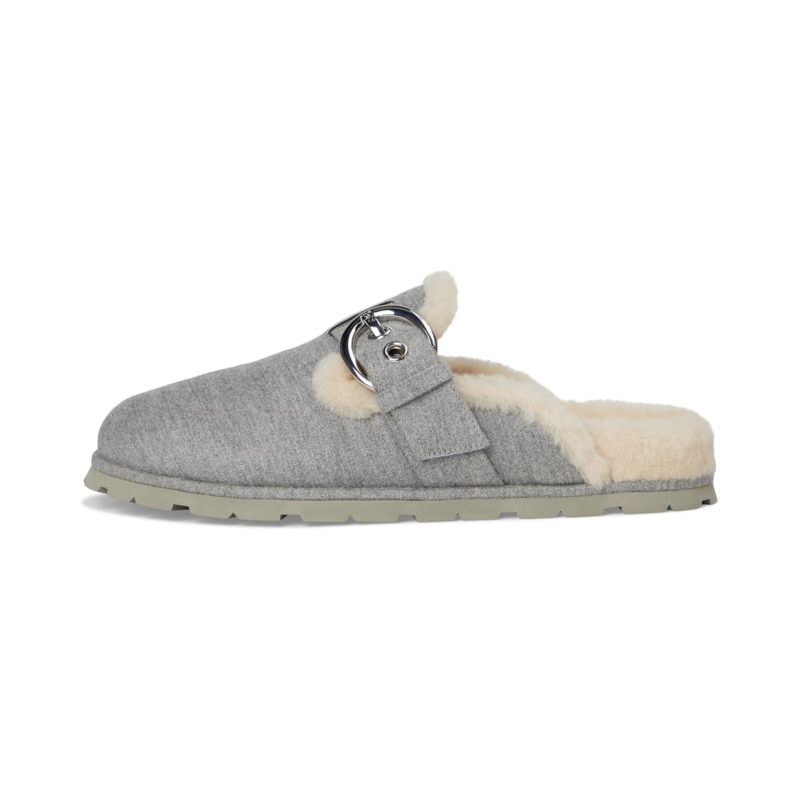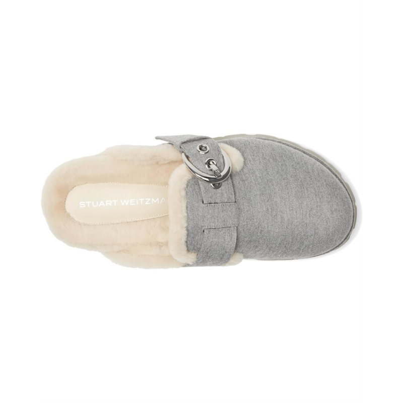 - The Stuart Weitzman Chrystie Shrling Mule is a luxurious flat designed to deliver cozy sophistication with every step. The footwear features a leather upper paired with a plush shearling lining, offering warmth and softness. A polished oversized buckle adds a refined touch, while the thermoplastic polyurethane outsole ensures durability.