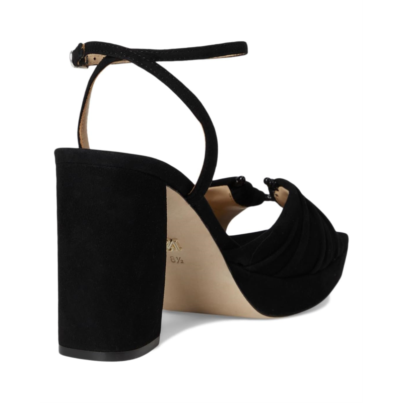 - Badgley Mischka Veda is the ultimate statement sandal for those who love to shine. Crafted with a luxe leather upper, lining, insole, and outsole, this platform sandal exudes sophistication from every angle. The standout ruched upper adds an eye-catching touch of texture, balancing elegance with a playful edge. Designed with a sturdy block heel, it provides both lift and stability, making it perfect for long nights on the dance floor or elevated daytime looks. The adjustable ankle buckle strap closure ensures a secure fit, while the platform construction gives you height without compromising on comfort.