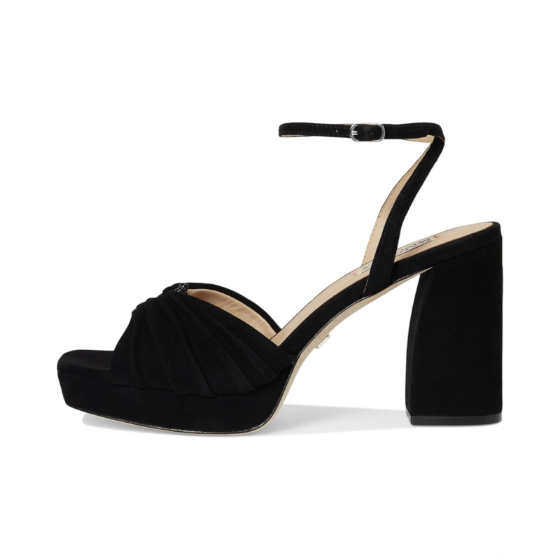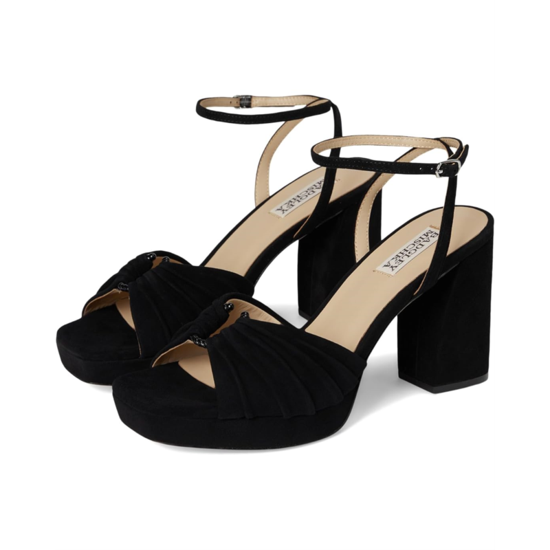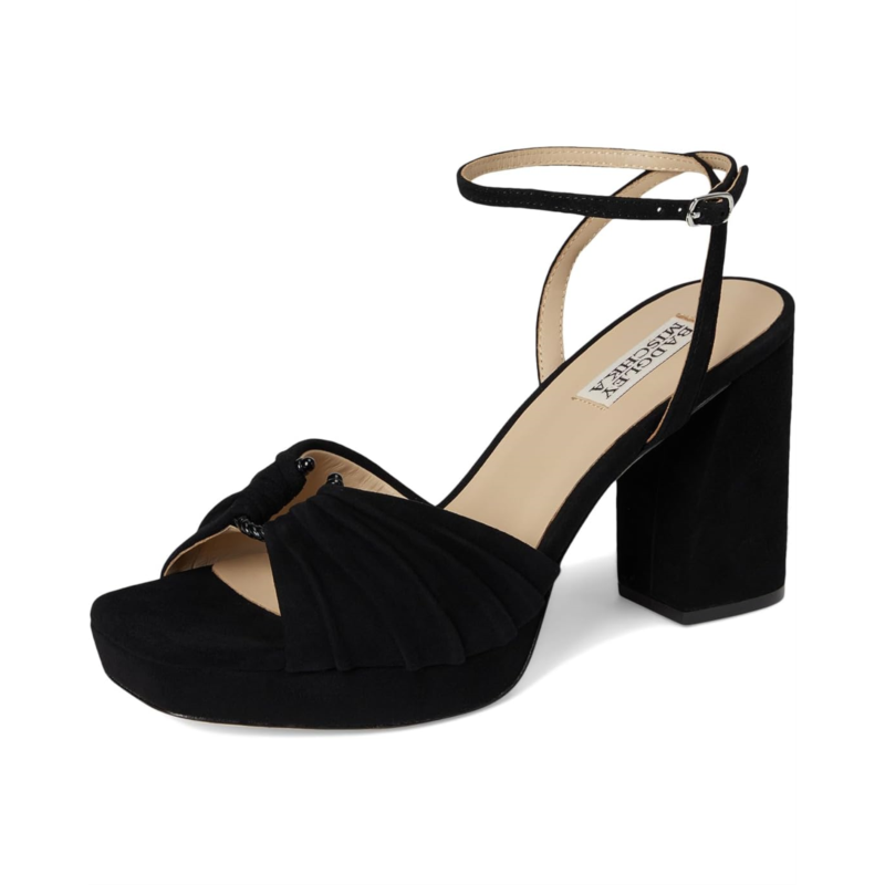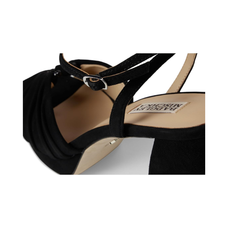 - Badgley Mischka Veda is the ultimate statement sandal for those who love to shine. Crafted with a luxe leather upper, lining, insole, and outsole, this platform sandal exudes sophistication from every angle. The standout ruched upper adds an eye-catching touch of texture, balancing elegance with a playful edge. Designed with a sturdy block heel, it provides both lift and stability, making it perfect for long nights on the dance floor or elevated daytime looks. The adjustable ankle buckle strap closure ensures a secure fit, while the platform construction gives you height without compromising on comfort.
