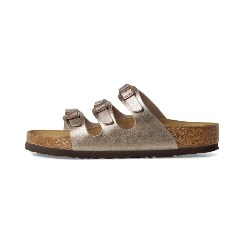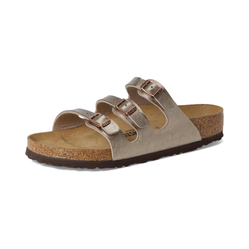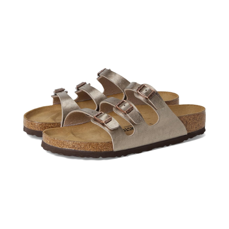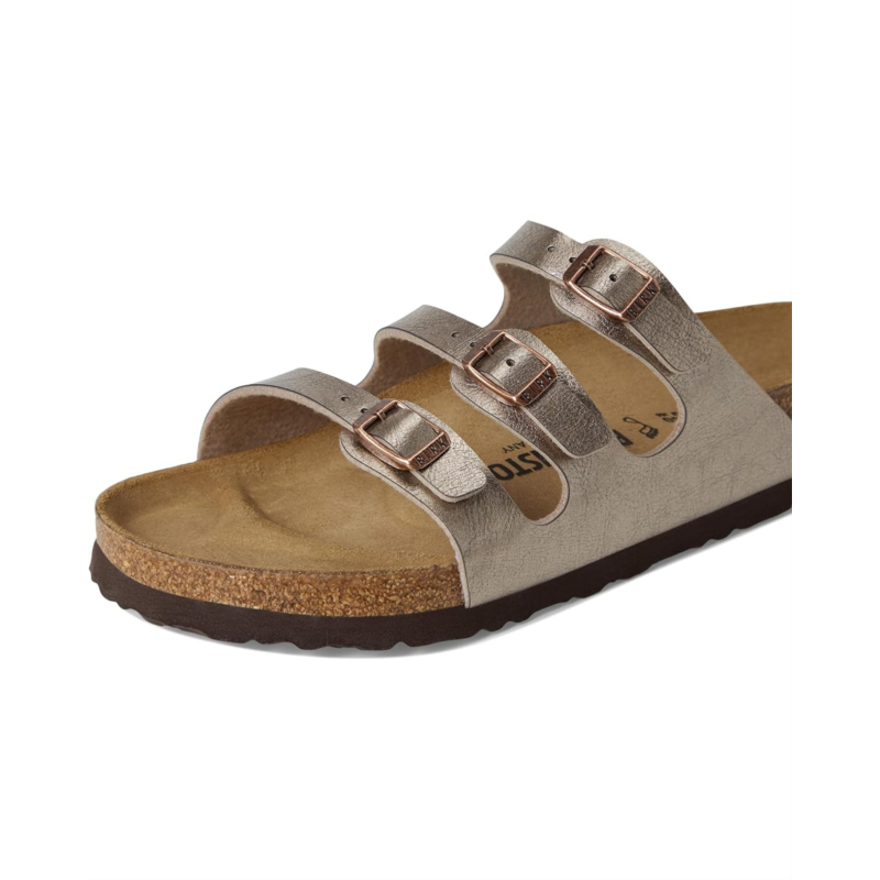 - Birkenstock has given the classic Florida model a new lease on life. Thanks to the three slender straps that can be adjusted, these sandals offer a customizable fit. The upper is made of skin-friendly, hard-wearing Birko-Flor material for added durability. These slip-on sandals are made of a soft polyester lining and a contoured cork-latex footbed that creates custom support with wear.