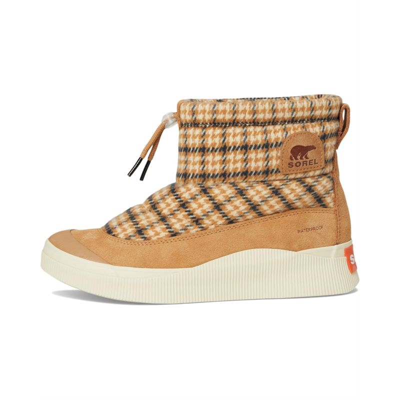 - Its all puff, no fluff with the SOREL Out N About Iv Puffy Waterproof boots. Their playful silhouette brings not only a modern vibe but also ultra warmth to brave the elements. These ankle boots are made of a molded PU STEADYSOLE footbed with vulcanized rubber foxing tape, cushioned insole, and fleece lining. The canvas upper features synthetic overlays and an adjustable drawstring with a toggle closure. Their waterproof bootie construction keeps your feet comfortable and dry, while the 200g insulation offers long-lasting warmth. These lace-up ankle boots are a perfect choice for your outdoor rides.