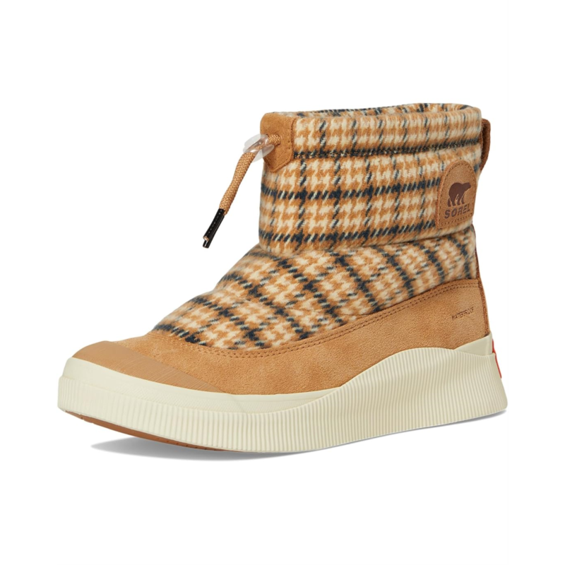 - Its all puff, no fluff with the SOREL Out N About Iv Puffy Waterproof boots. Their playful silhouette brings not only a modern vibe but also ultra warmth to brave the elements. These ankle boots are made of a molded PU STEADYSOLE footbed with vulcanized rubber foxing tape, cushioned insole, and fleece lining. The canvas upper features synthetic overlays and an adjustable drawstring with a toggle closure. Their waterproof bootie construction keeps your feet comfortable and dry, while the 200g insulation offers long-lasting warmth. These lace-up ankle boots are a perfect choice for your outdoor rides.