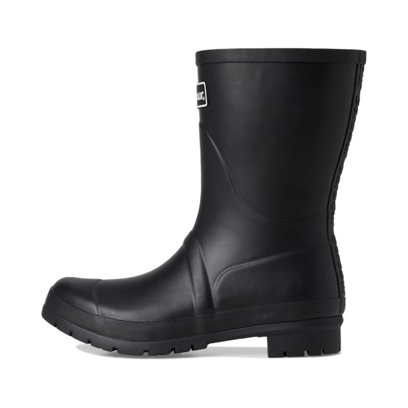 - Stay dry and fashionable wearing the Barbour Banbury Mid Welly boots! These versatile mid-calf boots feature an upper made with rubber and other fibers, making them perfect for braving the elements. The polyester lining and padded insole provide all-day comfort, while the sleek round toe design adds a sophisticated touch to your look.