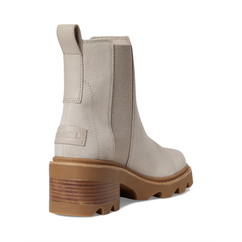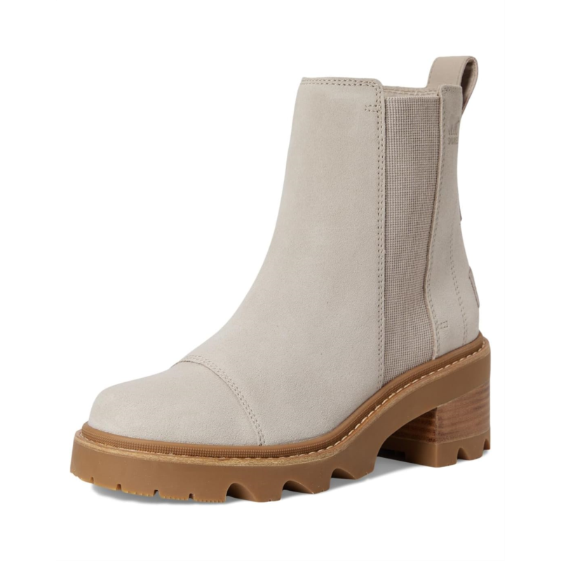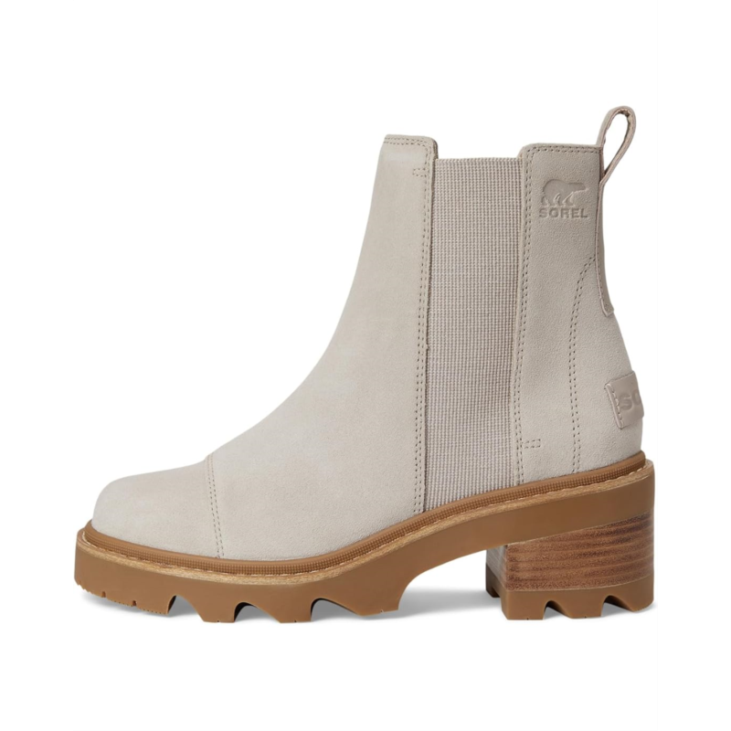 - Say hello to the SOREL Joan Now Chelsea. Featuring a luxe suede upper and a cozy fabric lining, this mid-top slip-on silhouette blends fashion with function. The adjustable gore detail ensures a flexible, easy fit, while the rubber welt construction with stitch detailing adds an artisanal flair. A chunky block heel rises above the rest- literally- while the high-traction rubber outsole keeps every step grounded, rain or shine.