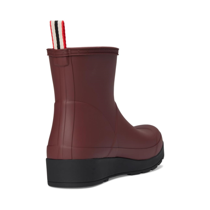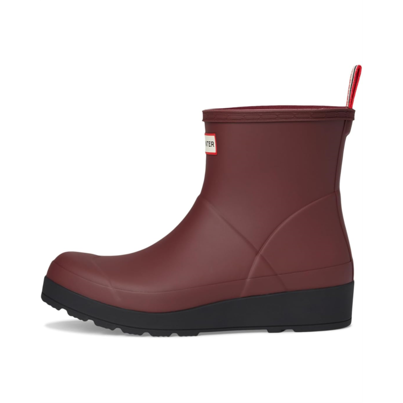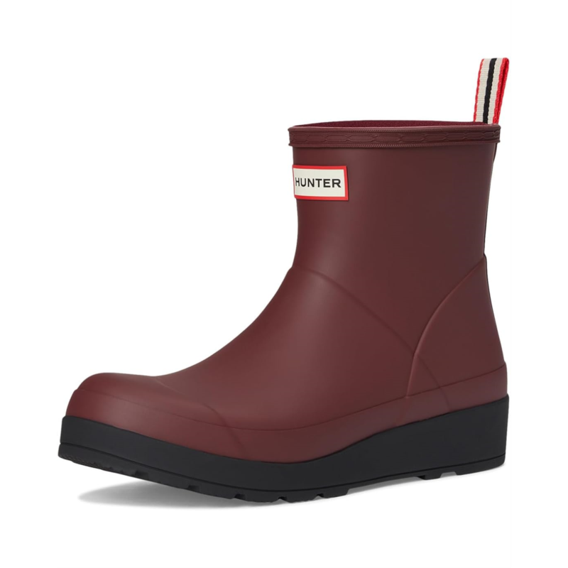 - Waterproof and durable, the Hunter Play Short Boots are perfect rain boots that keep your feet dry when out in the rain. The rubber upper of these boots features a heel pull loop for easy on and off. These waterproof boots are designed with a polyester insole and 100% recycled polyester lining that provides all-day comfort. The flatter platform rubber outsole of these boots ensures a durable grip. Get ready to play in the rain wearing these pull-on boots.
