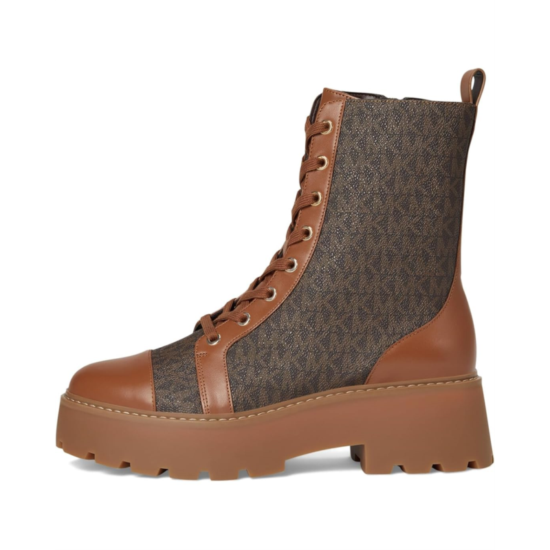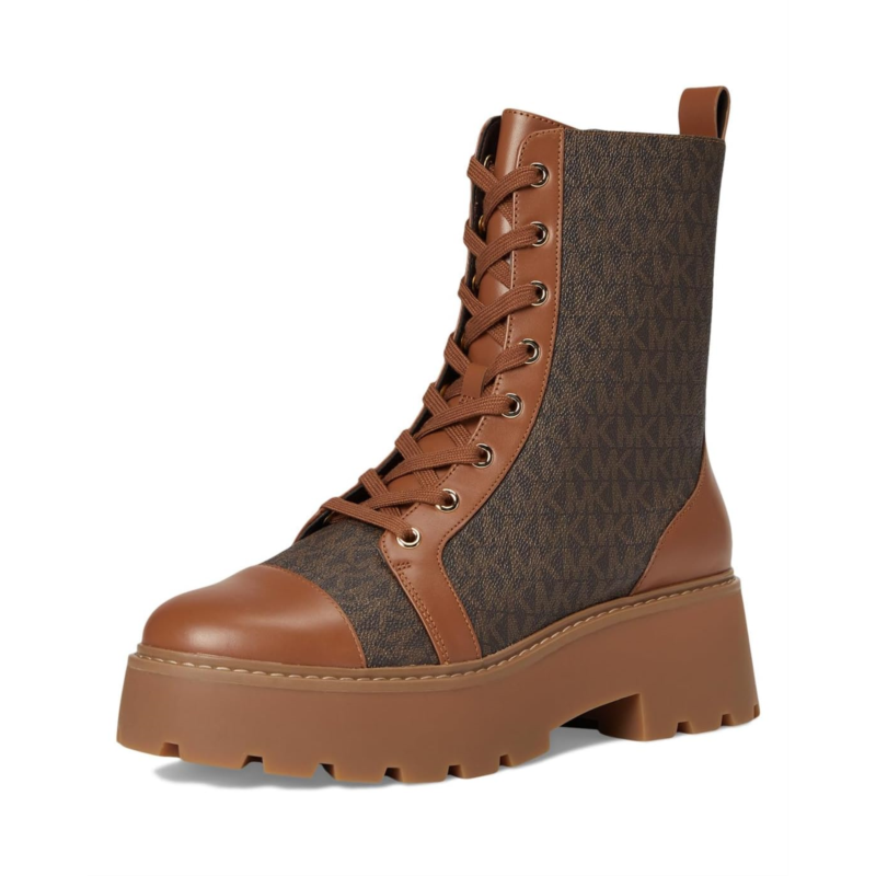- Combat style lace up bootie with lug sole, has back pull tab and interior zip for easy entry. Crafted from a leather upper, this boot brings all the attitude with a round toe silhouette, polyester lining and faux leather insole.