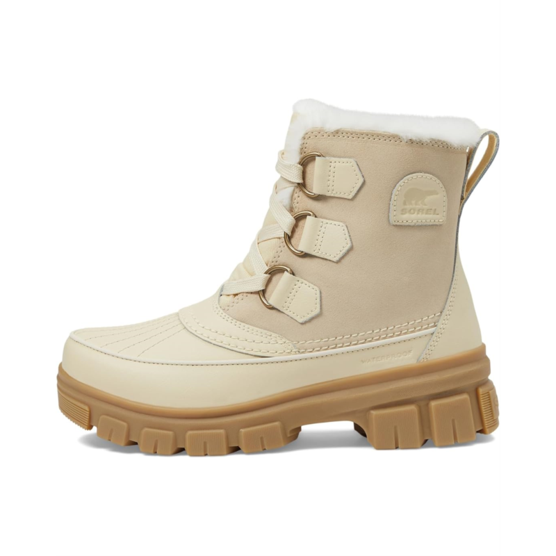 - Winter weather is no match for the SOREL Tivoli V Waterproof snow boots. Getting out and about is made easier thanks to the premium winterproof details and OutDry waterproof construction. Crafted from waterproof suede upper with PU coated leather mudguard and heel overlay. Features canvas tongue, faux fur collar with microfleece lining, removable plush PU-like EVA footbed with microfleece topcover, internal EVA drop-in pods, and molded rubber outsole. These mid-calf length flat heel boots feature round toe silhouette and lace-up closure. Laces are not waterproof.